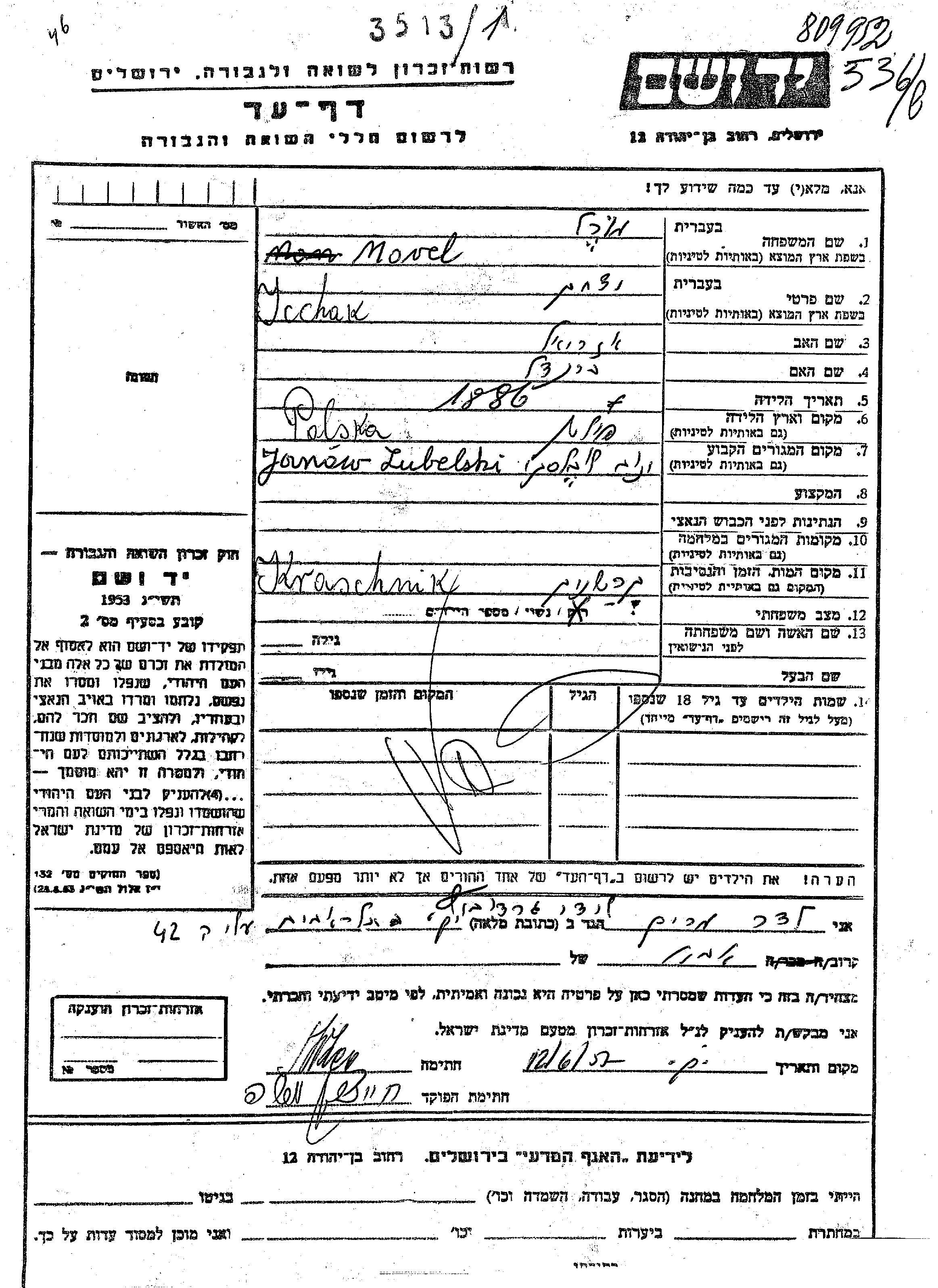 Icchak Morel נולד בפולין שבפולין בשנת 1886 לאזריאל וברנדל. הוא היה נשוי. לפני מלחמת העולם השניה התגורר בJanow שבפולין. הוא נרצח בשואה. מקום המוות: Krashnik שבפולין.