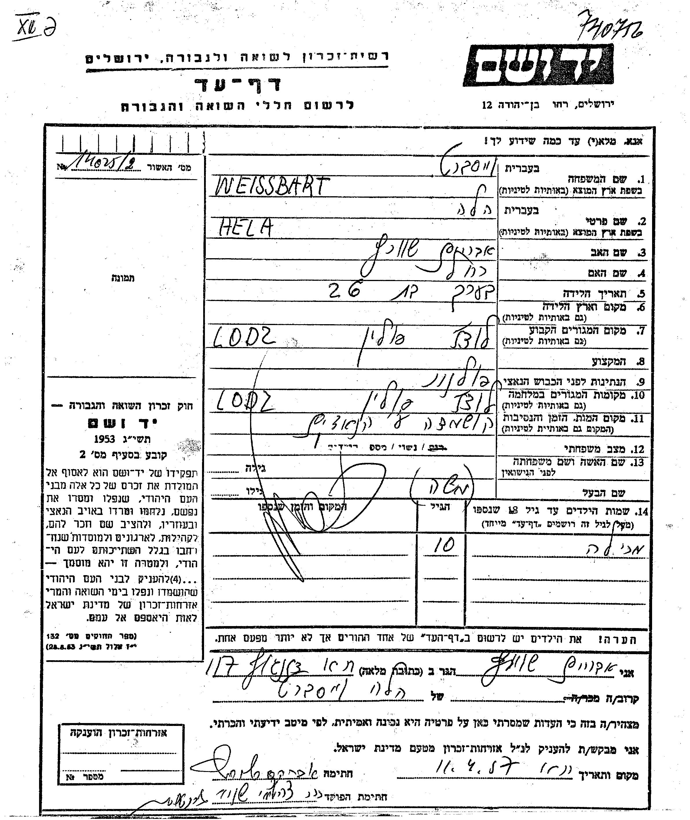 הלה Weissbart לבית שוורץ נולדה לאברהם ורחל. היא היתה נשואה למשה. לפני מלחמת העולם השניה התגוררה בLodz שבפולין. בזמן המלחמה היא היתה בLodz שבפולין.