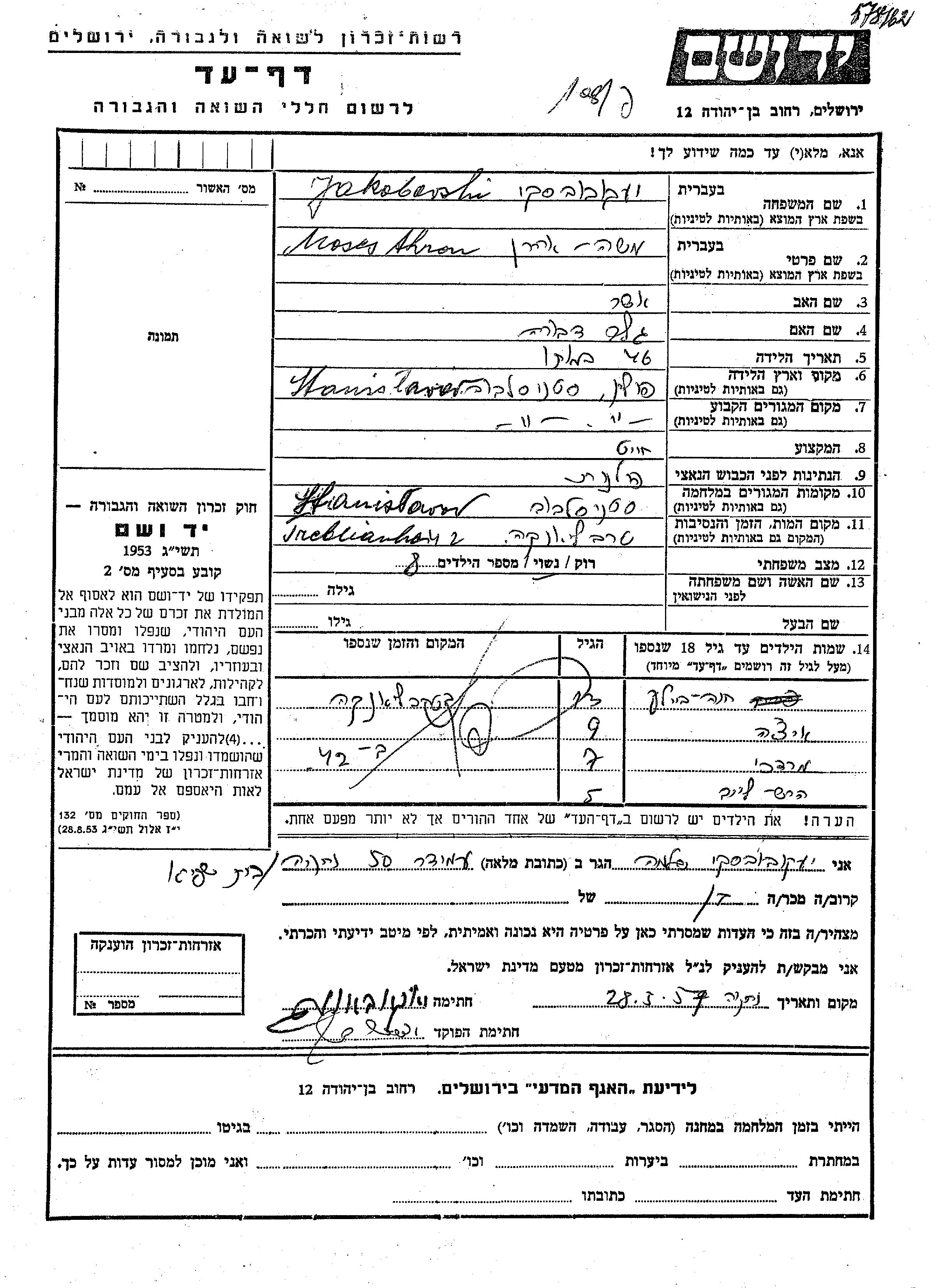 Moses Ahron Jakobovski נולד בStanislawow שבפולין לאשר ודבורה. הוא היה חייט ונשוי. לפני מלחמת העולם השניה התגורר בStanislawow שבפולין. בזמן המלחמה הוא היה בStanislawow שבפולין.