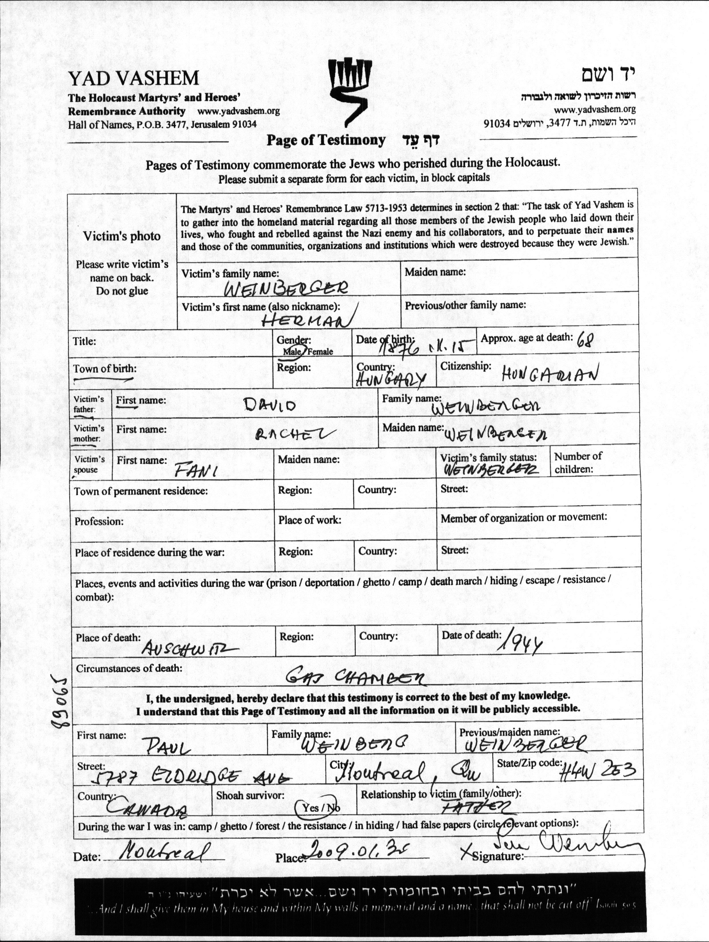 הרמן Weinberger נולד בהונגריה בשנת 1876 לדוד ורחל. הוא היה נשוי לפני. לפני מלחמת העולם השניה התגורר בהונגריה.
