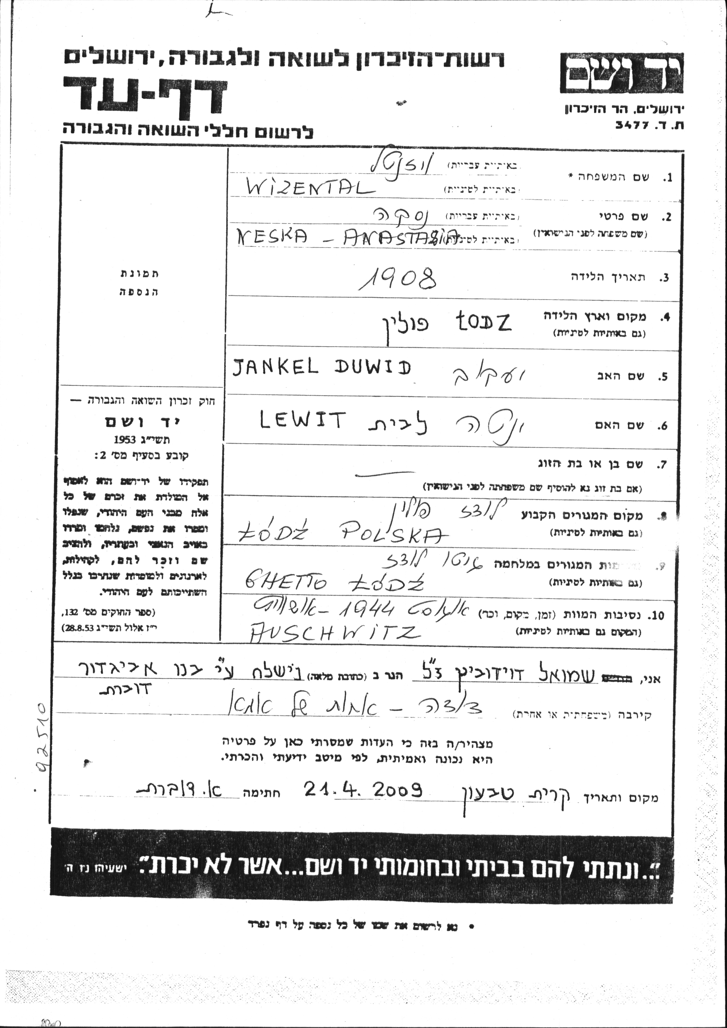 Wizental Neska אנסטסיה 1908 Lodz, פולין דף-עד