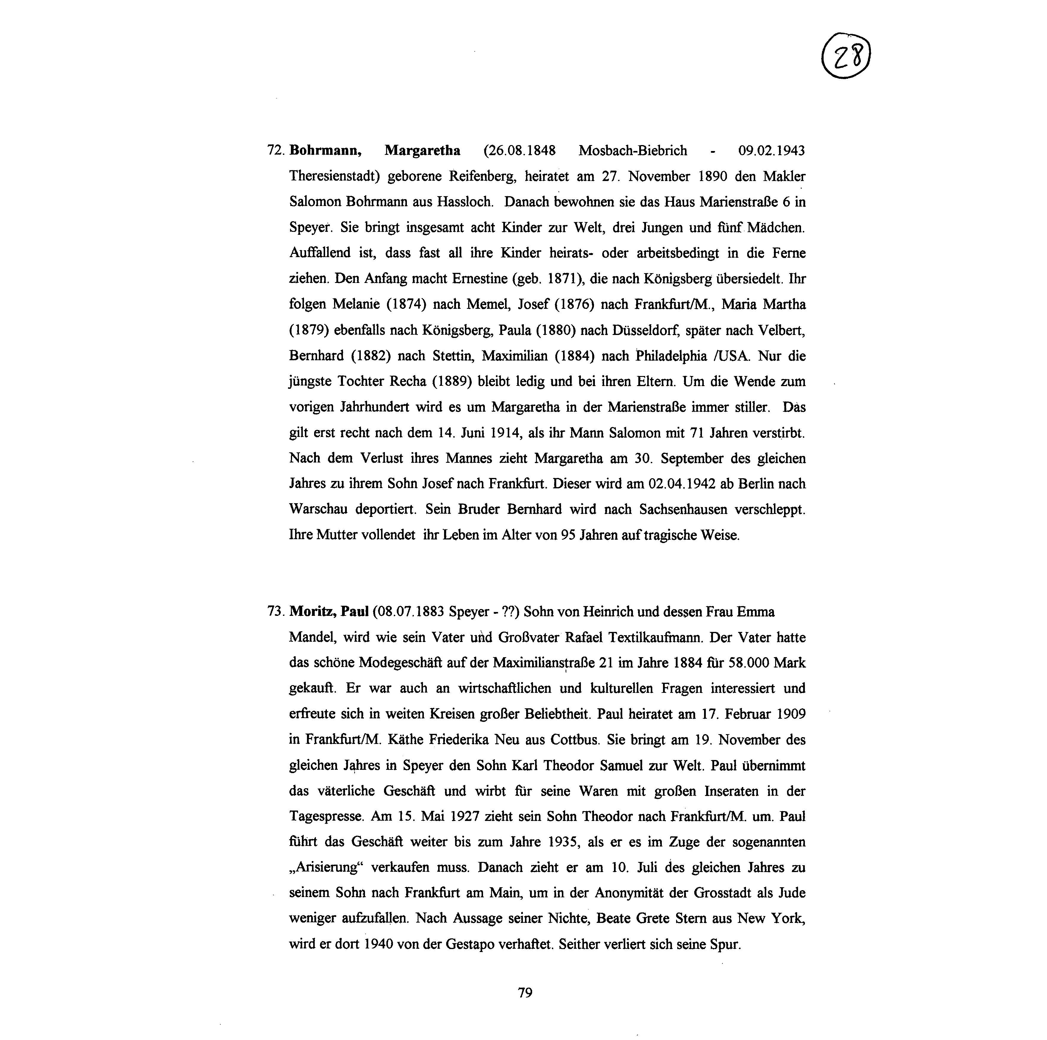 Margaretha Bohrmann לבית רייפנברג נולדה בMosbach שבגרמניה בשנת 1848. היא היתה נשואה לSalomon. לפני מלחמת העולם השניה התגוררה בSpeyer שבגרמניה. בזמן המלחמה היא היתה בFrankfurt שבגרמניה. היא נרצחה בשואה. מקום המוות: Theresienstadt שבצ'כוסלובקיה בשנת 09/02/1943.
