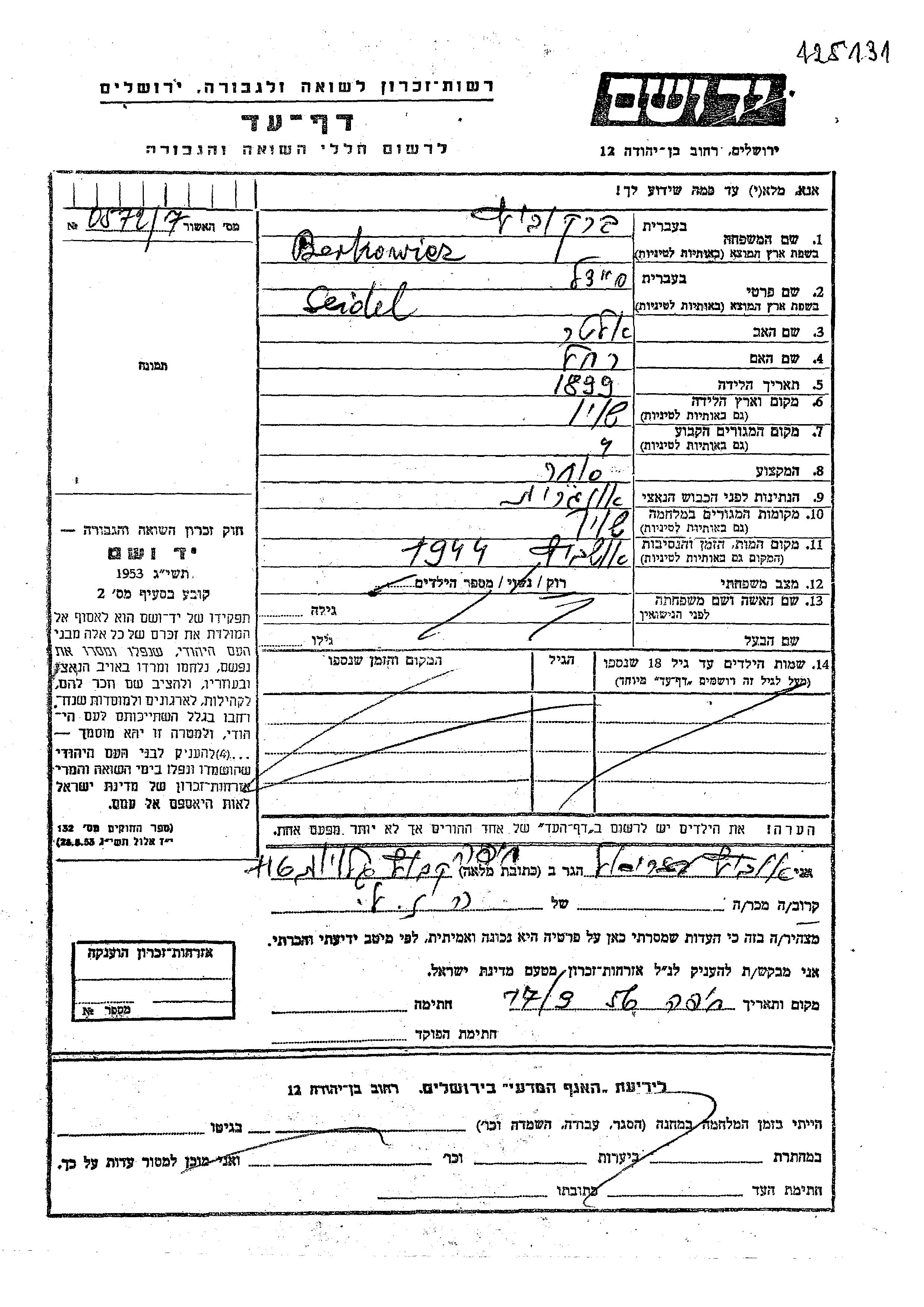 סיידל Berkowicz נולד בShojo שברומניה בשנת 1899 לאלטר ורחל. הוא היה סוחר ורווק. לפני מלחמת העולם השניה התגורר בShojo שברומניה. בזמן המלחמה הוא היה בShojo שברומניה. סיידל נרצח בשואה. מקום המוות: Auschwitz שבפולין בשנת 1944.