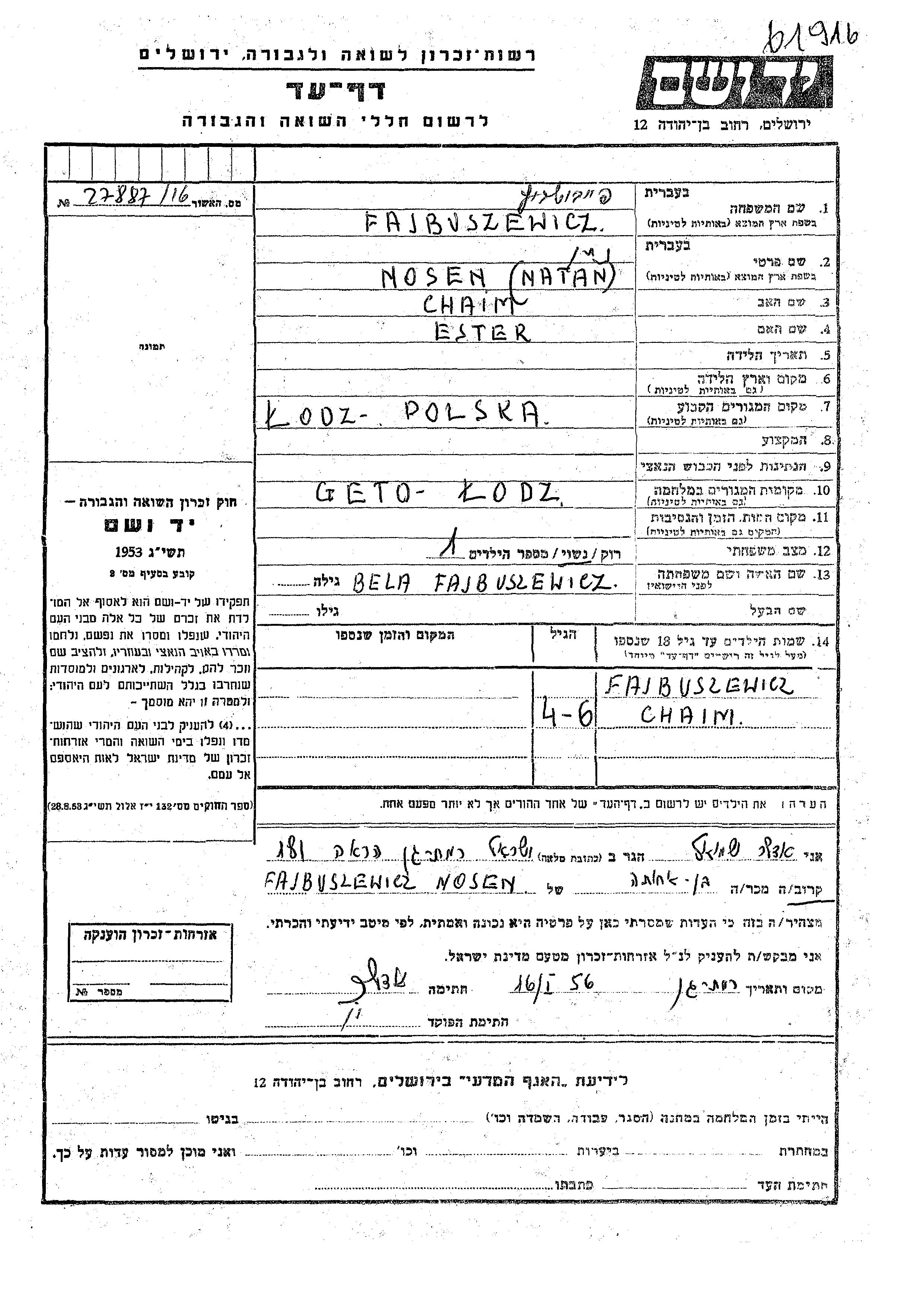 Nosen Fajbuszewicz נולד לחיים ואסתר. הוא היה נשוי לבלה. לפני מלחמת העולם השניה התגורר בLodz שבפולין. בזמן המלחמה הוא היה בLodz שבפולין. הוא נרצח בשואה.