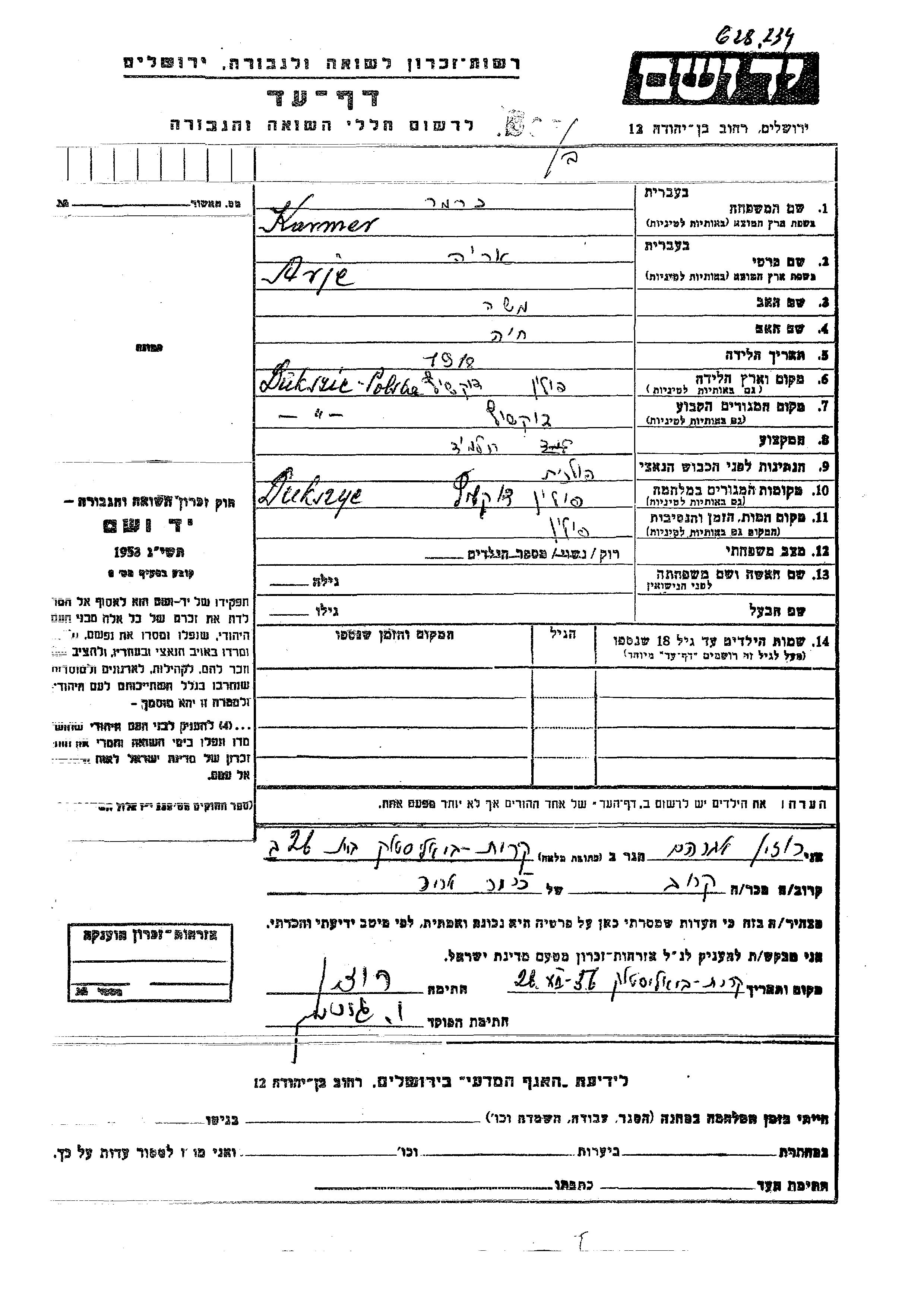 Arje קרמר כרמר נולד בDukszic שבפולין בשנת 1918 למשה וחיה. הוא היה תלמיד ורווק. לפני מלחמת העולם השניה התגורר בDukszic שבפולין. בזמן המלחמה הוא היה בDukszic שבפולין.