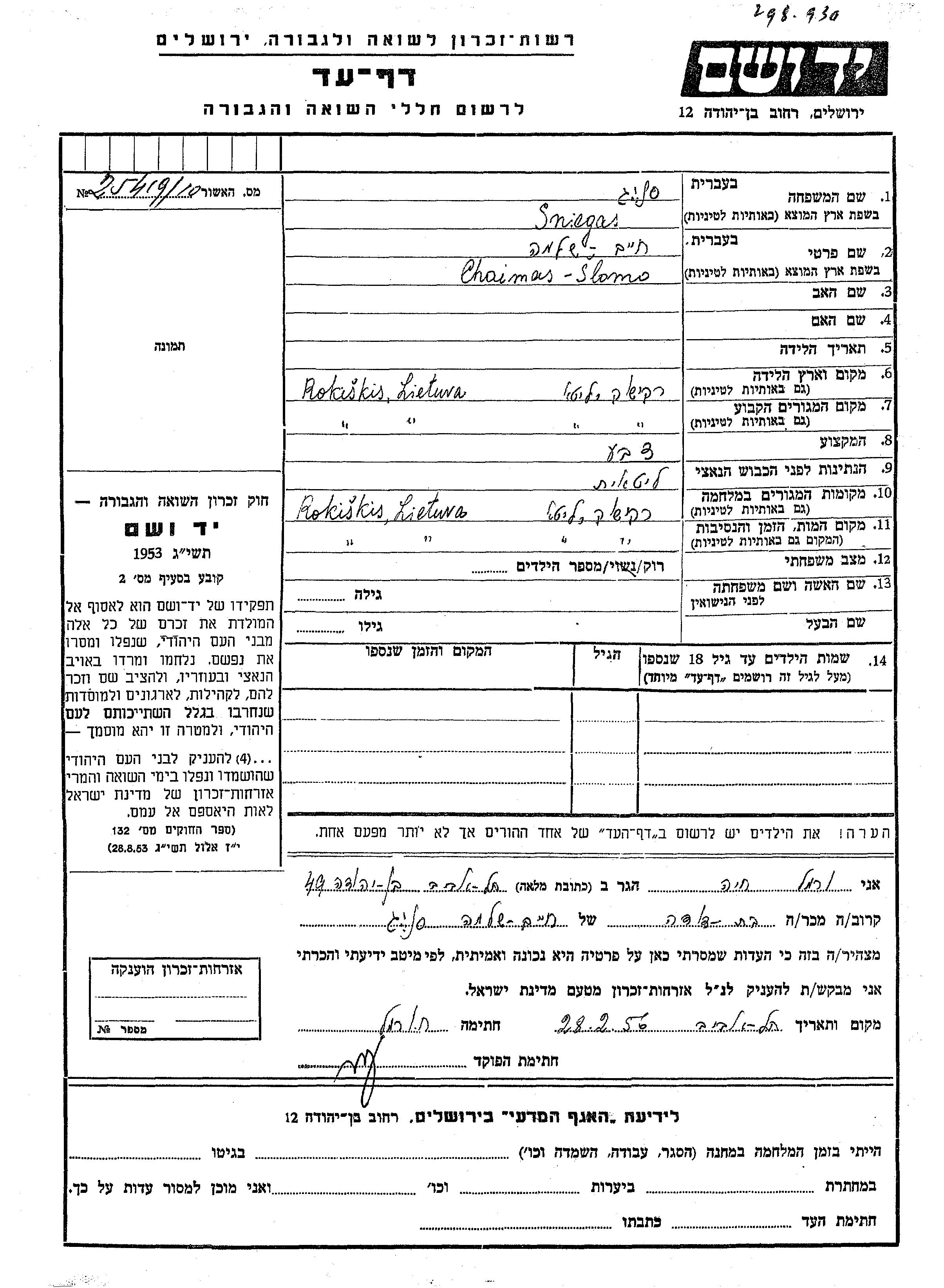 Chaimas Slomo Sniegas נולד בRokiškis שבליטא. הוא היה צבע ורווק. לפני מלחמת העולם השניה התגורר בRokiškis שבליטא. בזמן המלחמה הוא היה בRokiškis שבליטא. הוא נרצח בשואה. מקום המוות: Rokiškis שבליטא.