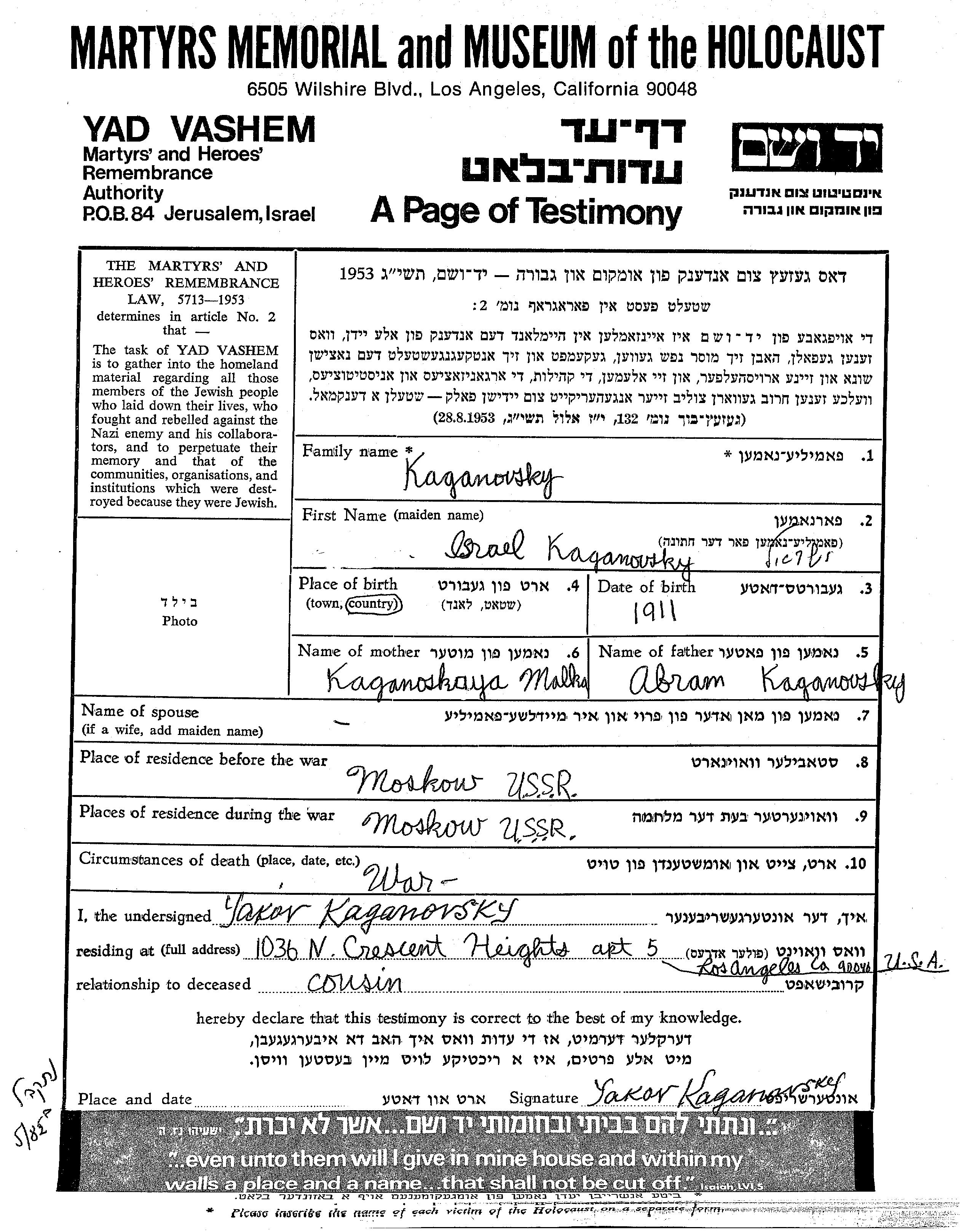 Israel Kaganovsky נולד בשנת 1911 לאברם ומלכה. לפני מלחמת העולם השניה התגורר בMoscow שברוסיה (ברה"מ). בזמן המלחמה הוא היה בMoscow שברוסיה (ברה"מ).