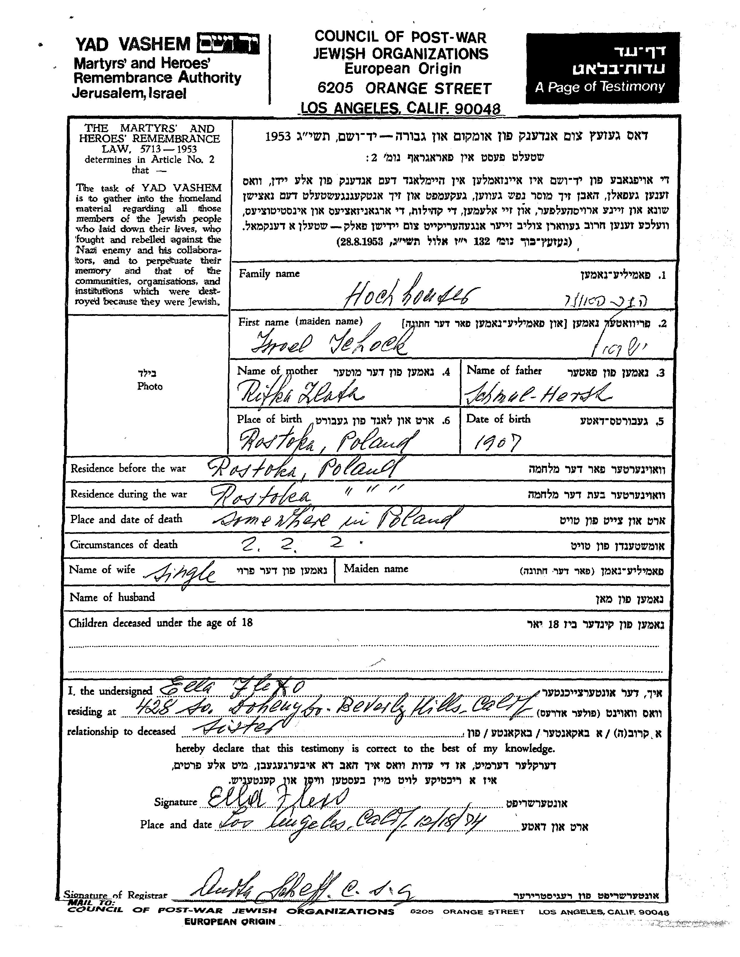 Hochhouser Israel Ichock 1907 Roztoka Wielka, פולין דף-עד