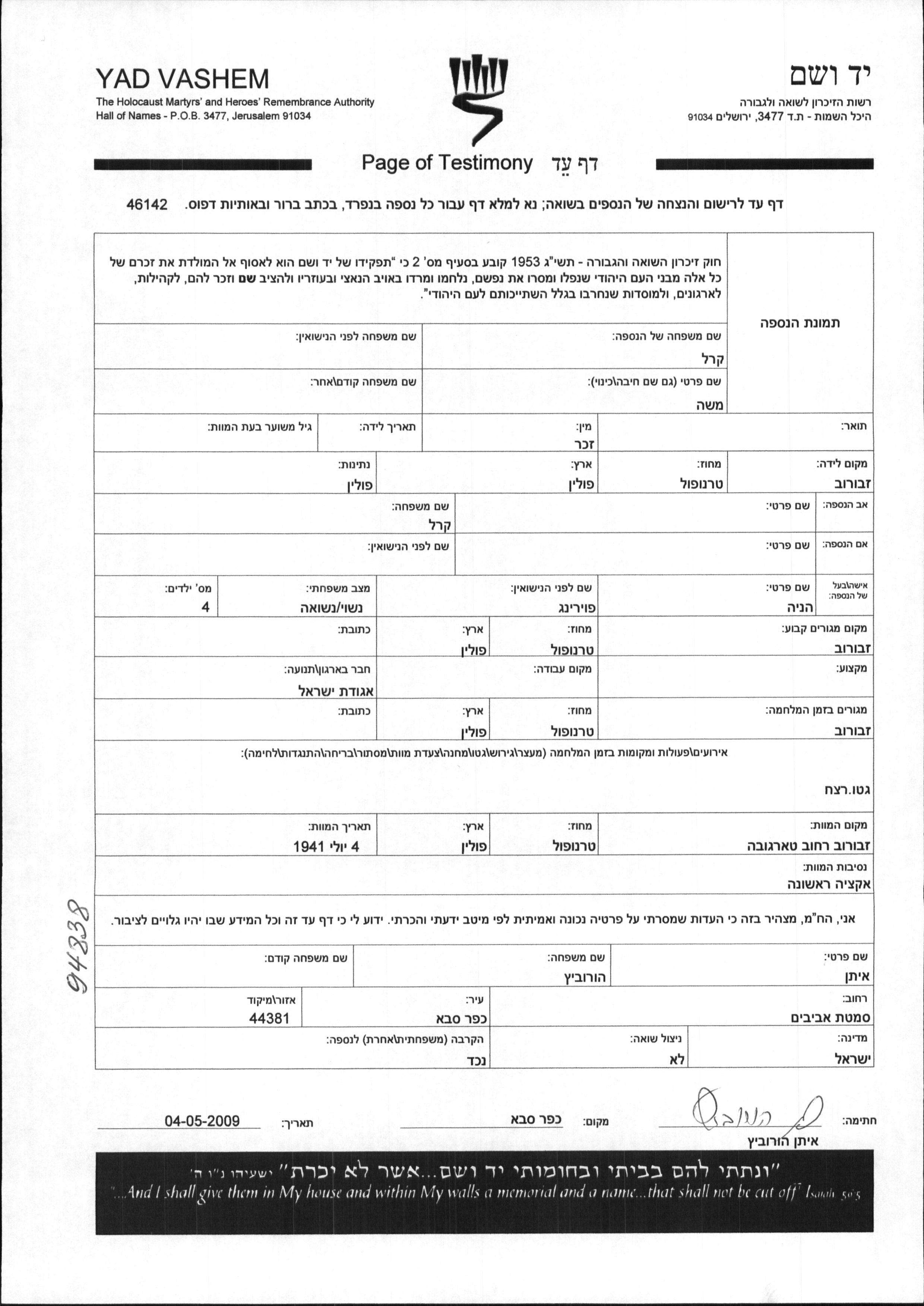 משה נרצח בשואה. מקום המוות: Zborow שבפולין בשנת 04/07/1941.
