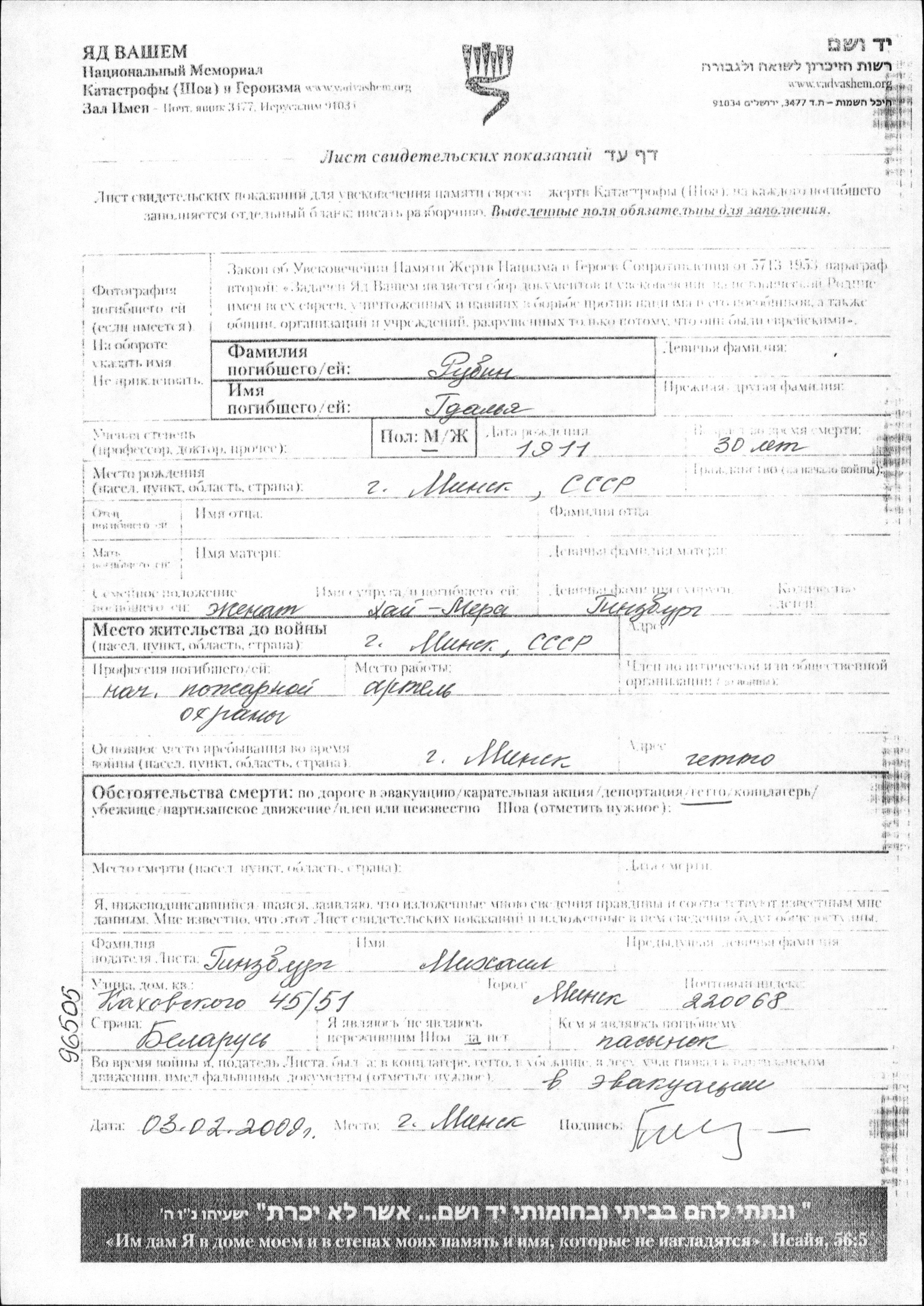 הוא נרצח בשואה. מקום המוות: Minsk שבביאלורוסיה (ברה"מ).