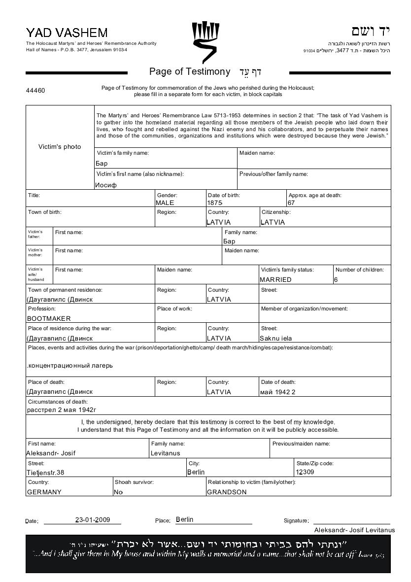 הוא נרצח בשואה. מקום המוות: Dvinsk שבלטביה בשנת 02/05/1942.