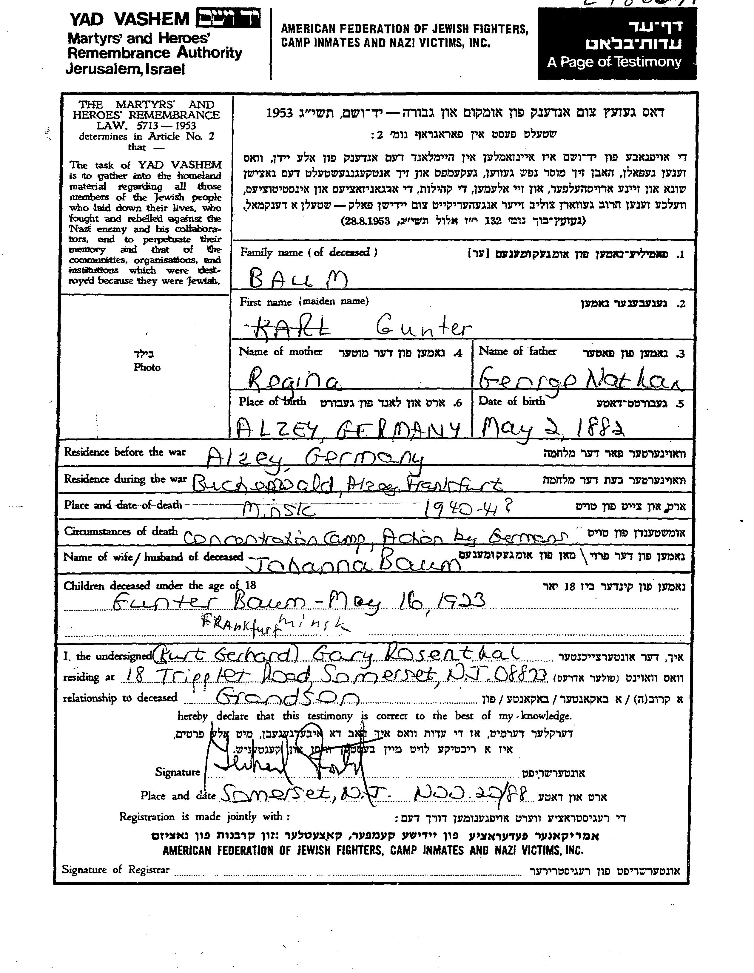 Gunter באום נולד בשנת 1923 לGunter וJohanna. הוא היה ילד. לפני מלחמת העולם השניה התגורר בAlzey שבגרמניה. בזמן המלחמה הוא היה בBuchenwald שבגרמניה.
