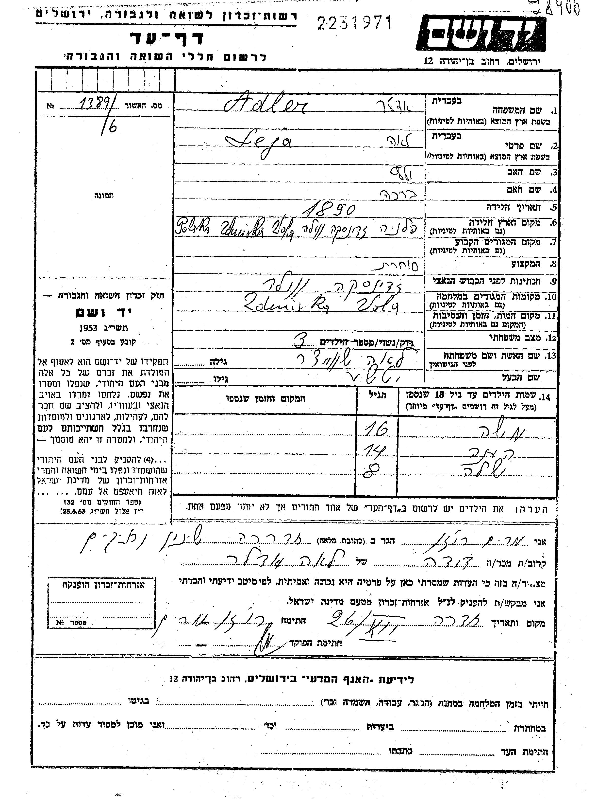 שלה אדלר נולד/ה לIche וLeja לבית שווייצר. הוא/היא היה/היתה ילד/ילדה. לפני מלחמת העולם השניה התגורר/התגוררה בZdunska Wola שבפולין. בזמן המלחמה הוא/היא היה/היתה בZdunska Wola שבפולין. שלה נרצח/ה בשואה.