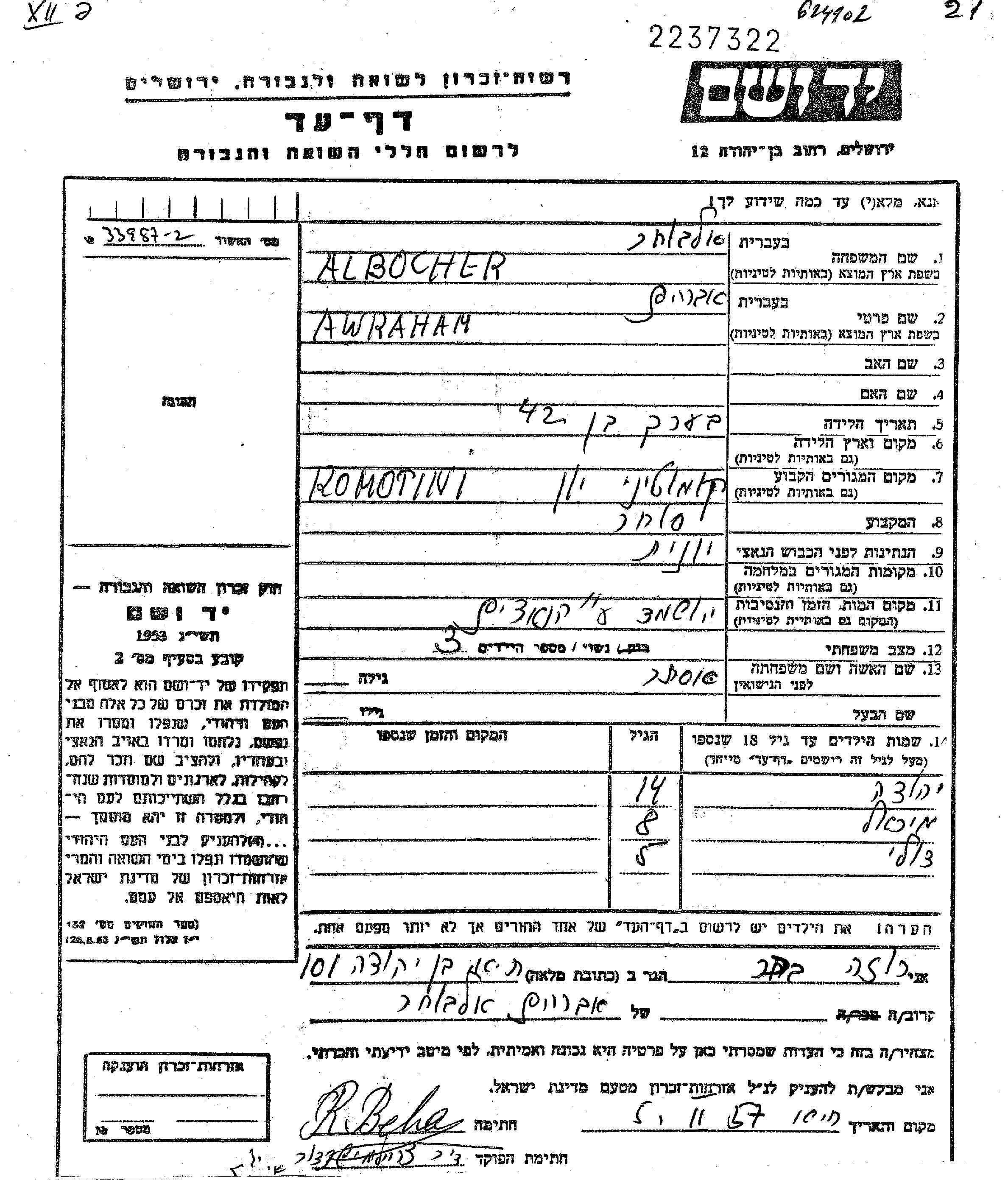 מיכאל Albocher נולד/ה לAwraham ואסתר. הוא/היא היה/היתה ילד/ילדה. לפני מלחמת העולם השניה התגורר/התגוררה בKomotini שביון.