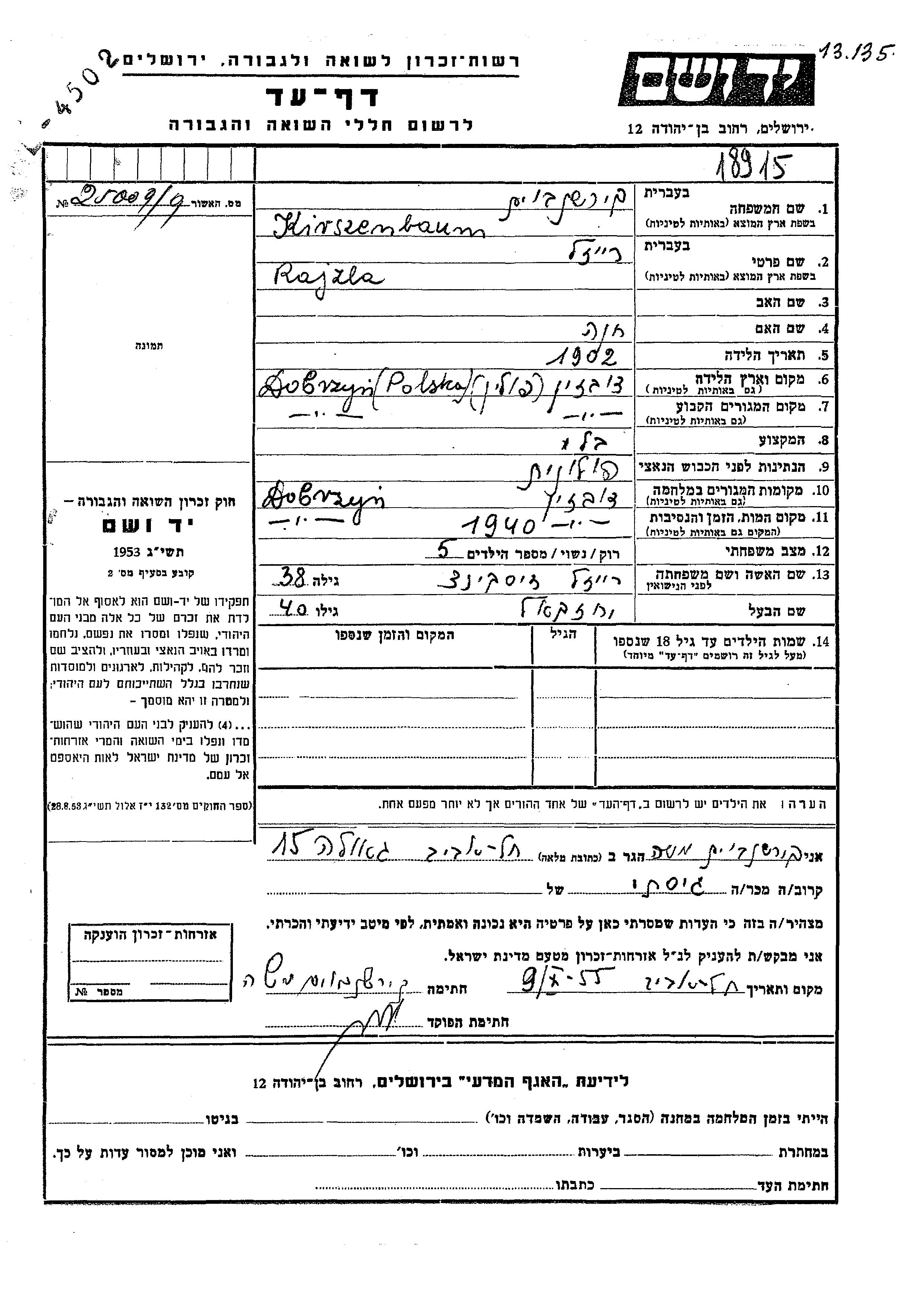 Rajzla Kirszenbaum לבית זיסקינד נולדה בDobrzyn שבפולין בשנת 1902 לחנה. היא היתה נשואה ליחזקאל. לפני מלחמת העולם השניה התגוררה בDobrzyn שבפולין. בזמן המלחמה היא היתה בDobrzyn שבפולין.
