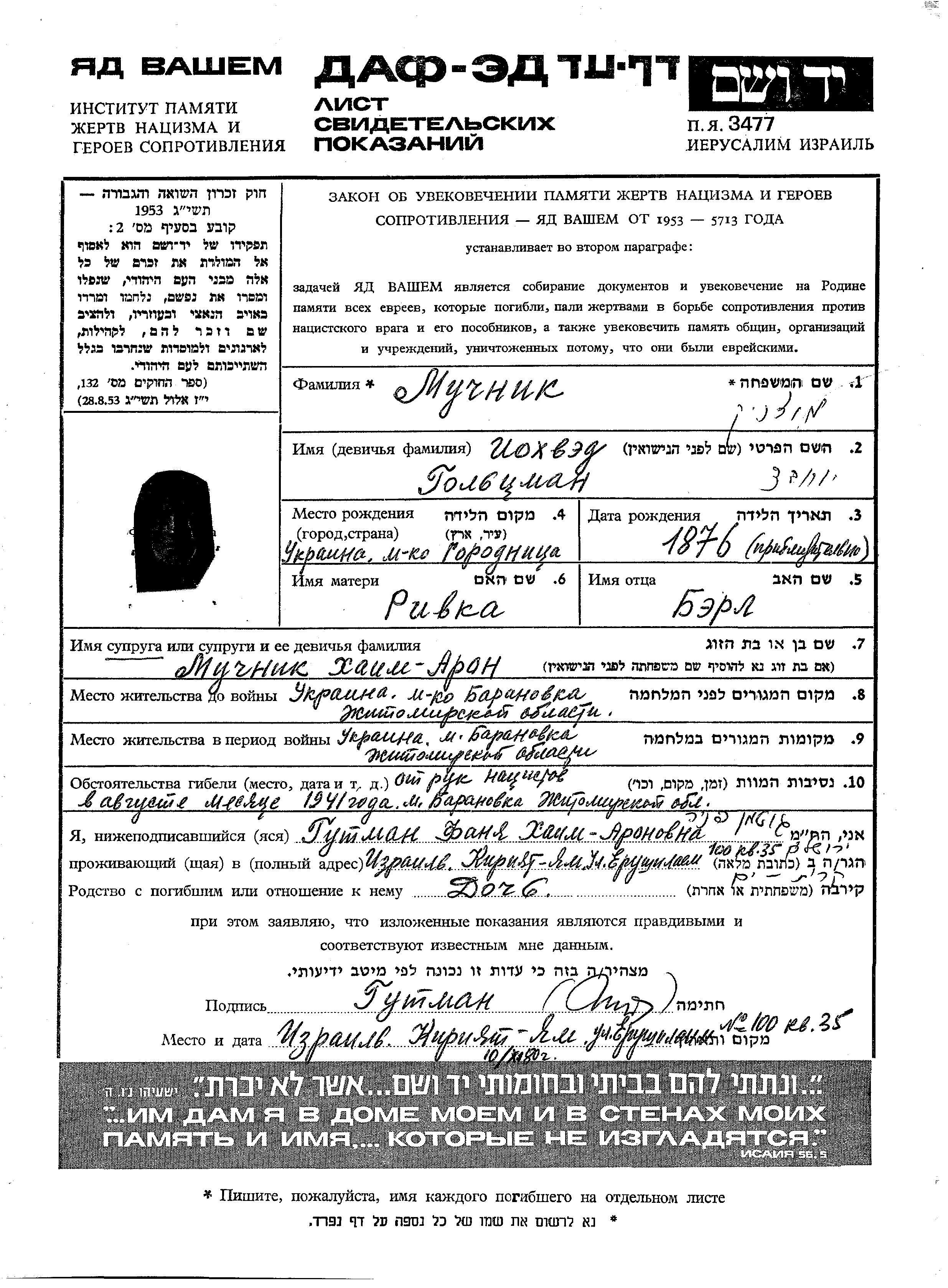 יוכבד חנה נרצחה בשואה. מקום המוות: Baranovka שבאוקראינה (ברה"מ) בשנת 08/1941.