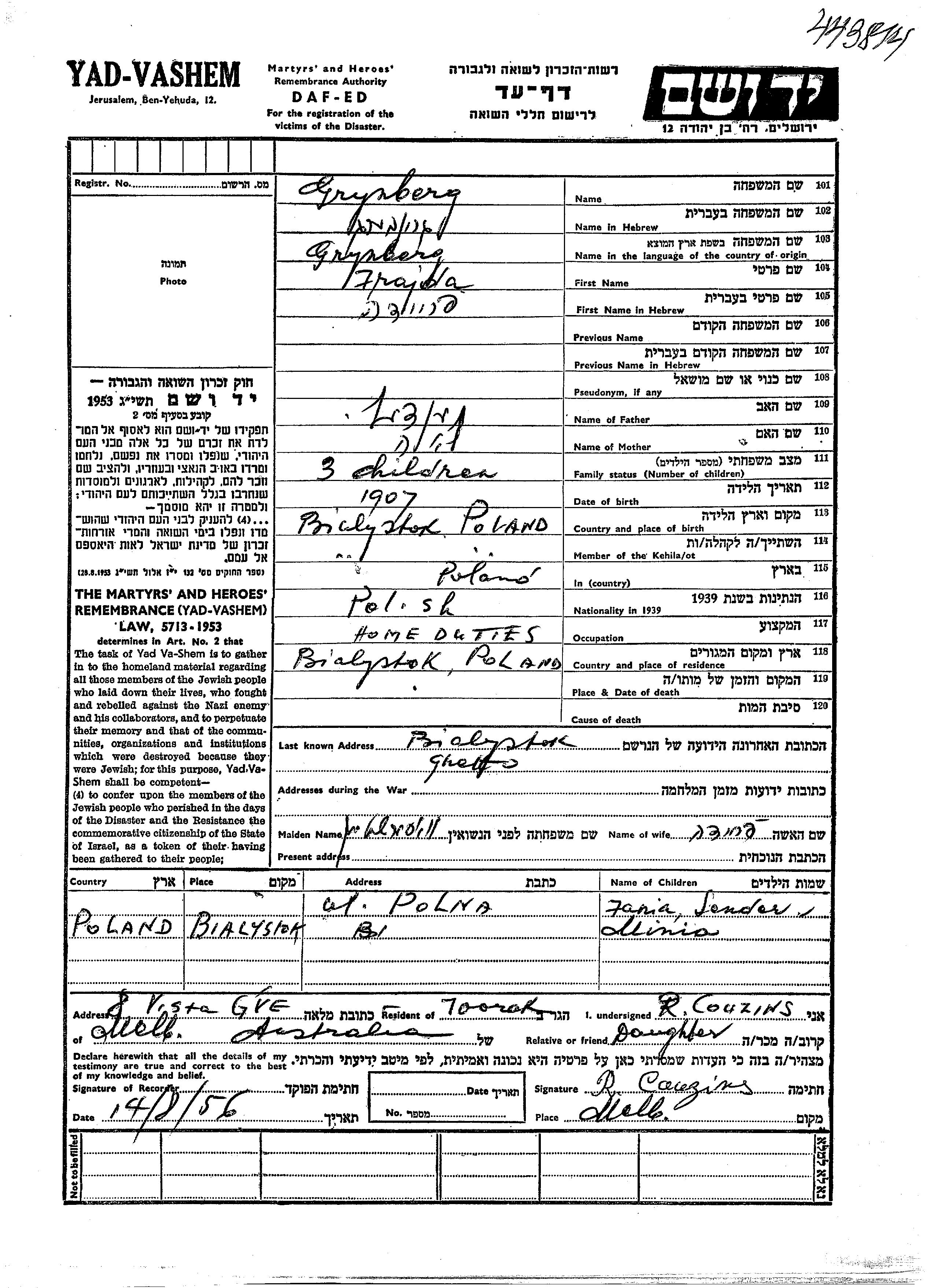 Frajda פריידה Grynberg לבית וואסערשטיין נולדה בBialystok שבפולין בשנת 1907 למענדעל ולאה. היא היתה עקרת בית. לפני מלחמת העולם השניה התגוררה בBialystok שבפולין. בזמן המלחמה היא היתה בBialystok שבפולין. היא נרצחה בשואה.