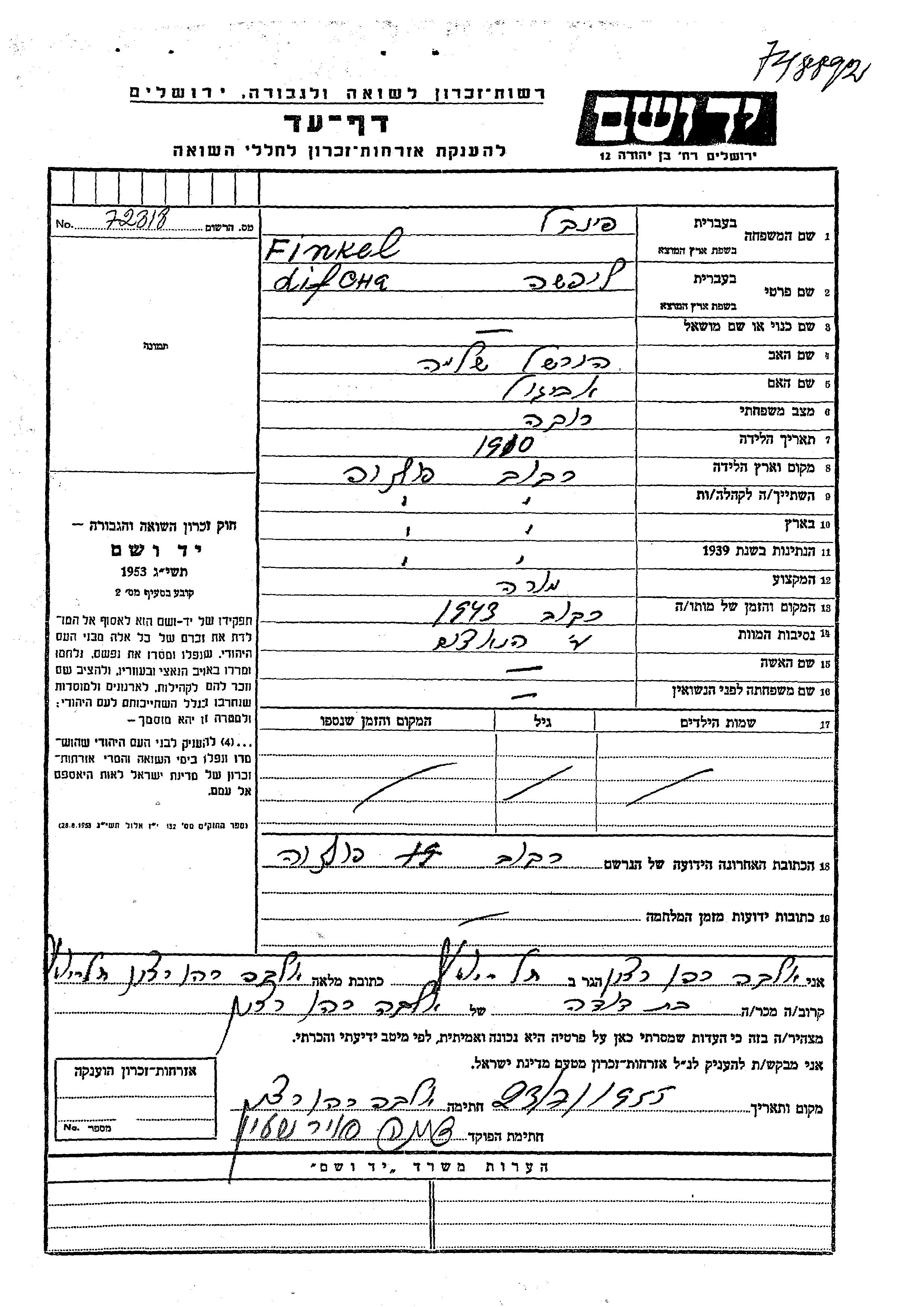 Lifcha פינקל נולדה בRakow שבפולין בשנת 1910 להירשל שלמה ואביגיל. היא היתה מורה ורווקה. לפני מלחמת העולם השניה התגוררה בRakow שבפולין. בזמן המלחמה היא היתה בRakow שבפולין. היא נרצחה בשואה. מקום המוות: Rakow שבפולין בשנת 1943.