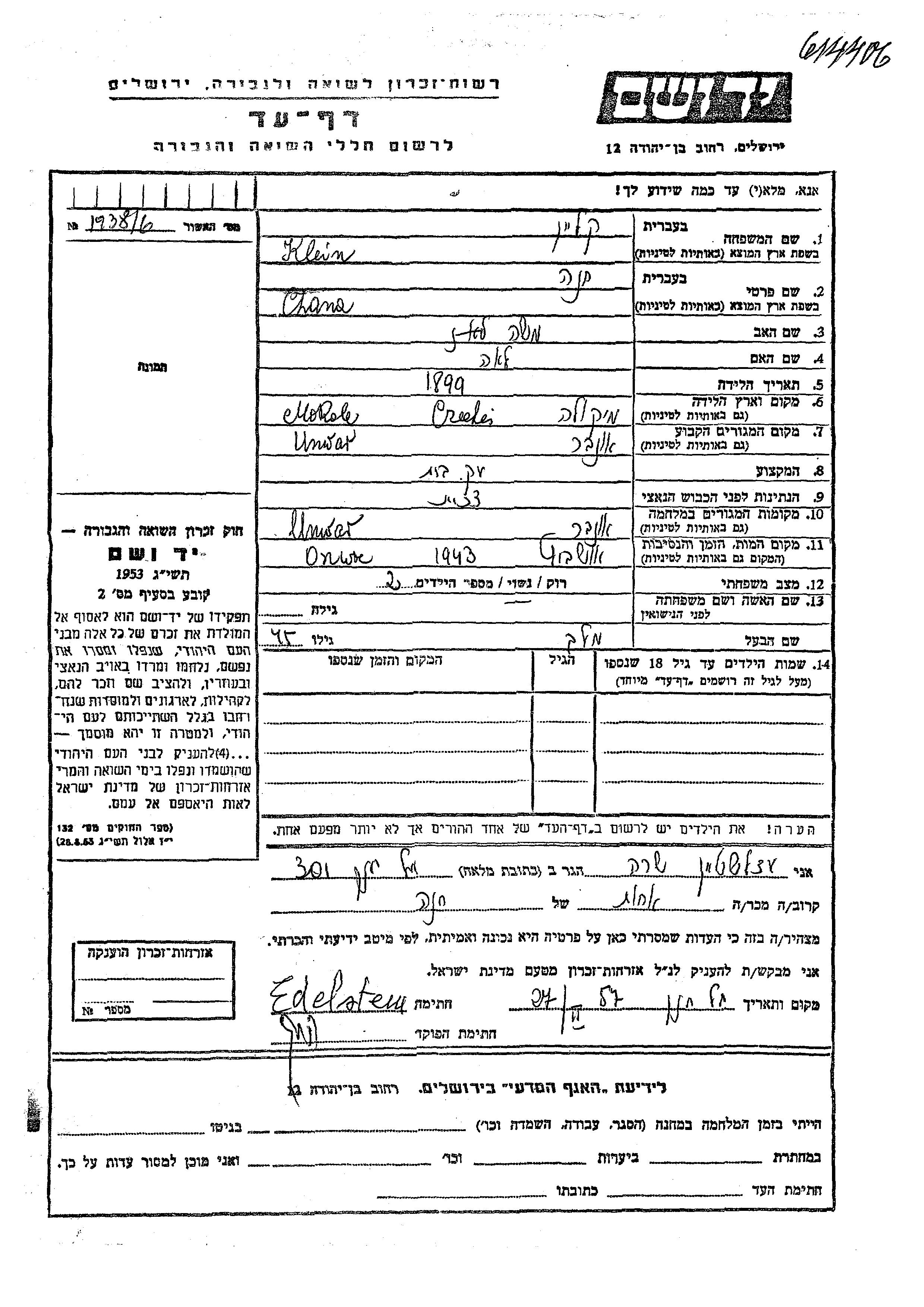 קליין חנה 1899 Ungwar, צ'כוסלובקיה דף-עד