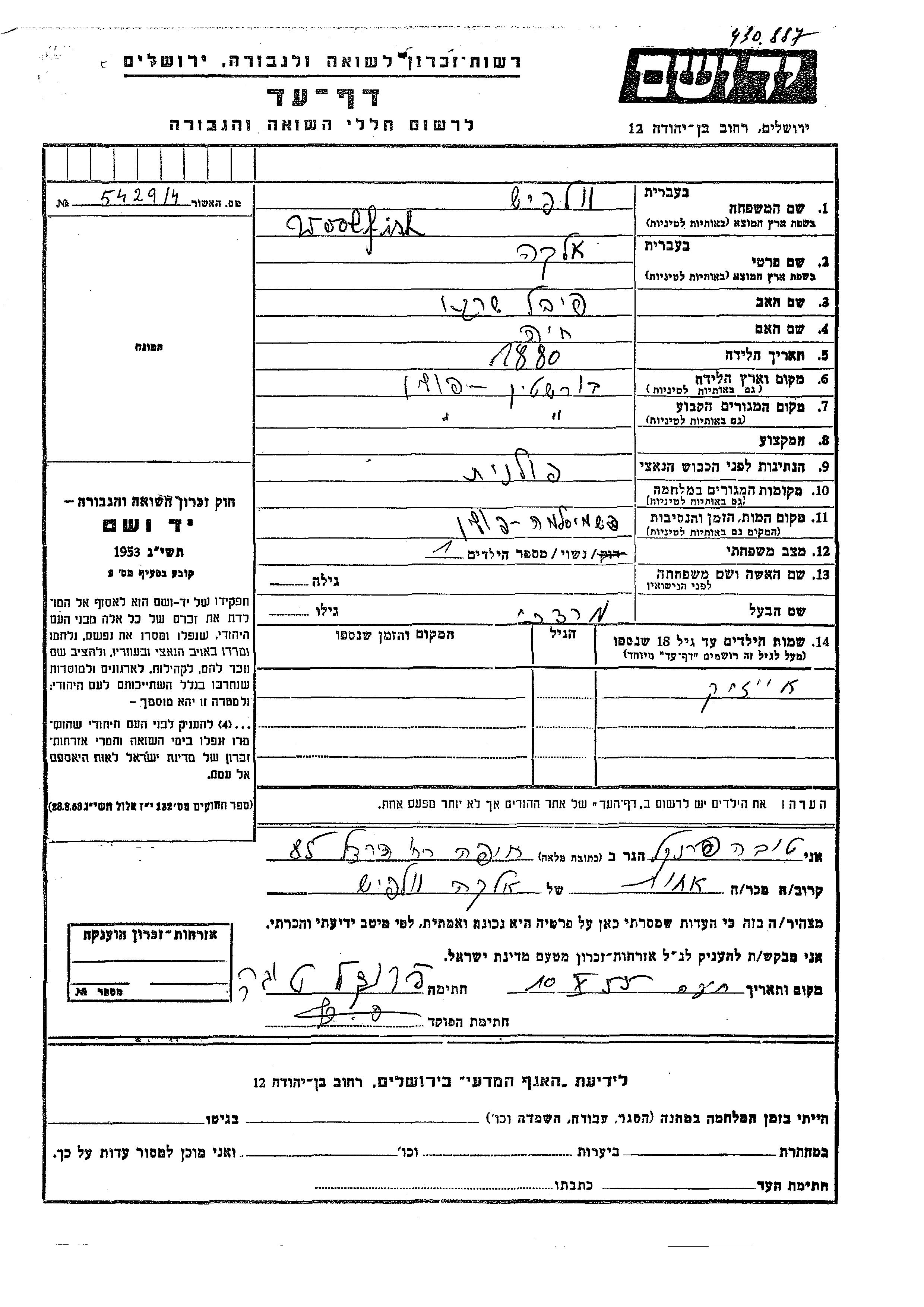אלקה Woolfish נולדה בBursztyn שבפולין בשנת 1880 לפיבל שרגא וחיה. היא היתה נשואה למרדכי. לפני מלחמת העולם השניה התגוררה בBursztyn שבפולין. אלקה נרצחה בשואה. מקום המוות: Pschemsl שבפולין.