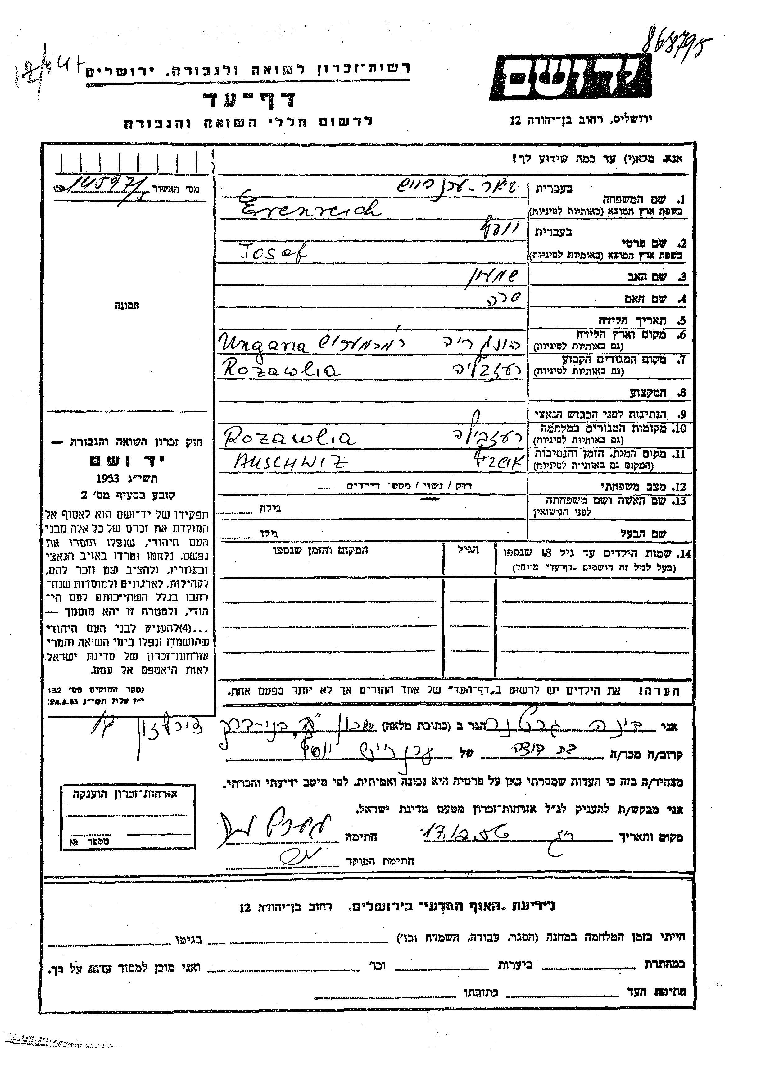 Josef Erenreich נולד בהונגריה לשמעון ושרה. הוא היה נשוי. לפני מלחמת העולם השניה התגורר בRozawlia שברומניה. בזמן המלחמה הוא היה בRozawlia שברומניה. הוא נרצח בשואה. מקום המוות: Auschwitz שבפולין.