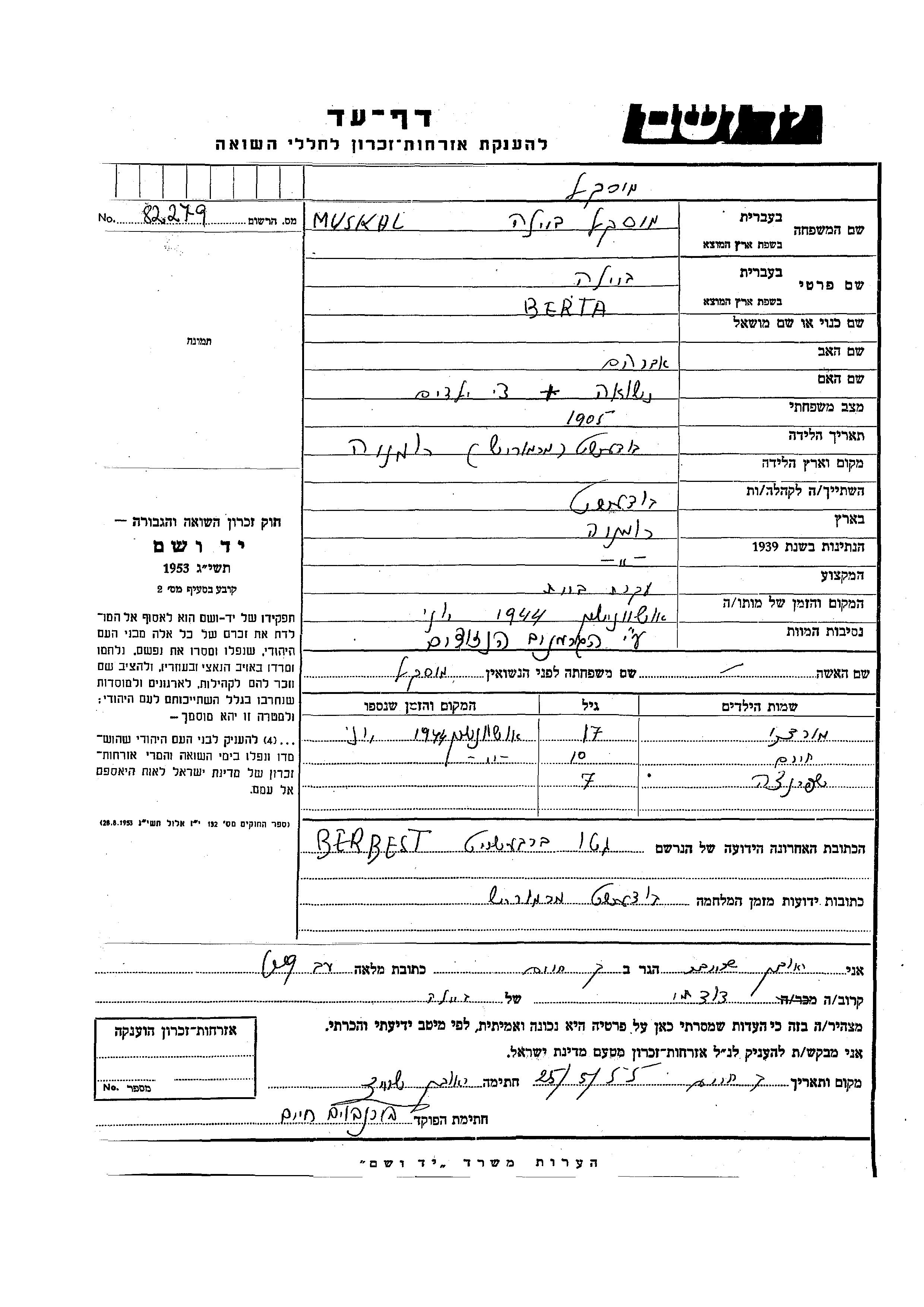 ביילה ברטה מוסקל נולדה בBudesti Maramures שברומניה בשנת 1905 לאברהם. היא היתה עקרת בית ונשואה. לפני מלחמת העולם השניה התגוררה בBudesti שברומניה. בזמן המלחמה היא היתה בBudesti Maramures שברומניה. ביילה ברטה נרצחה בשואה. מקום המוות: Auschwitz שבפולין בשנת 06/1944.