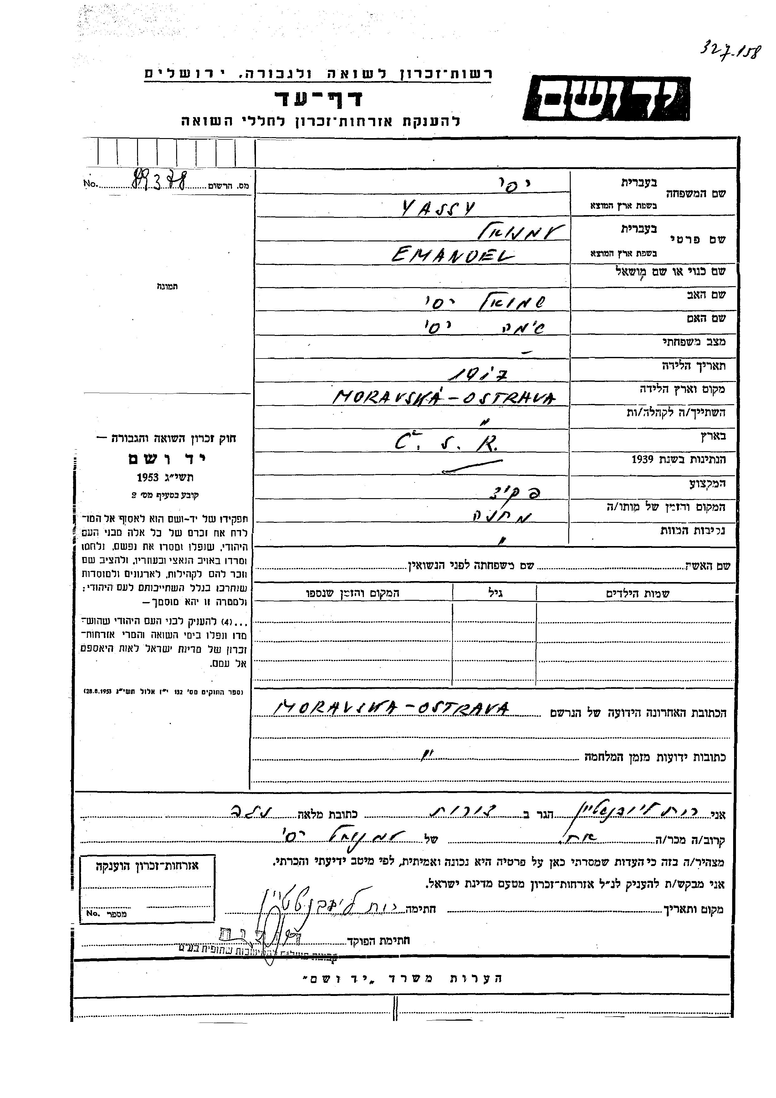 עמנואל Yassy נולד בMoravska Ostrava שבצ'כוסלובקיה בשנת 1917 לשמואל ושימה. הוא היה פקיד. לפני מלחמת העולם השניה התגורר בMoravska Ostrava שבצ'כוסלובקיה. בזמן המלחמה הוא היה בMoravska Ostrava שבצ'כוסלובקיה.