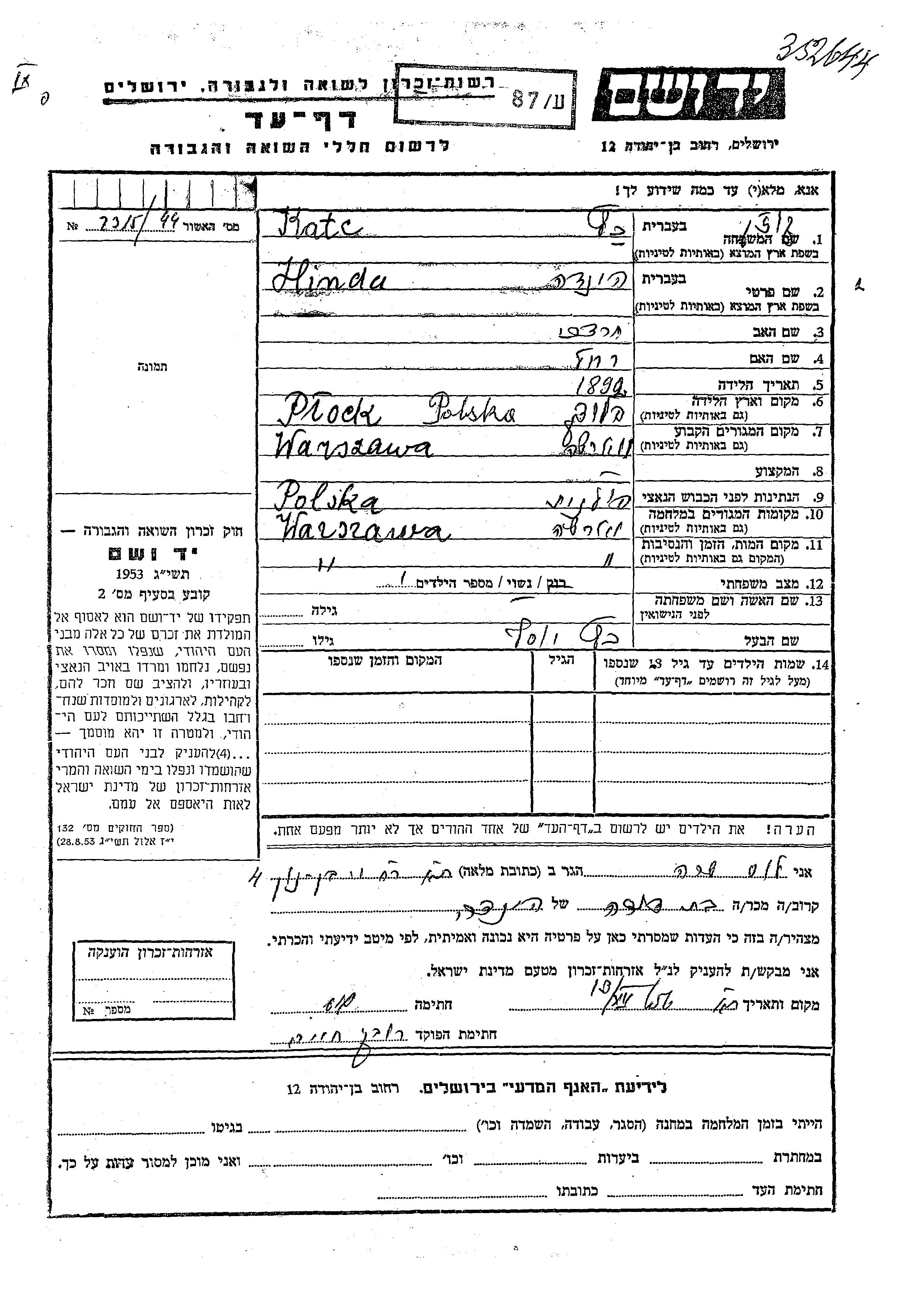 הינדה נרצחה בשואה. מקום המוות: Warszawa שבפולין.