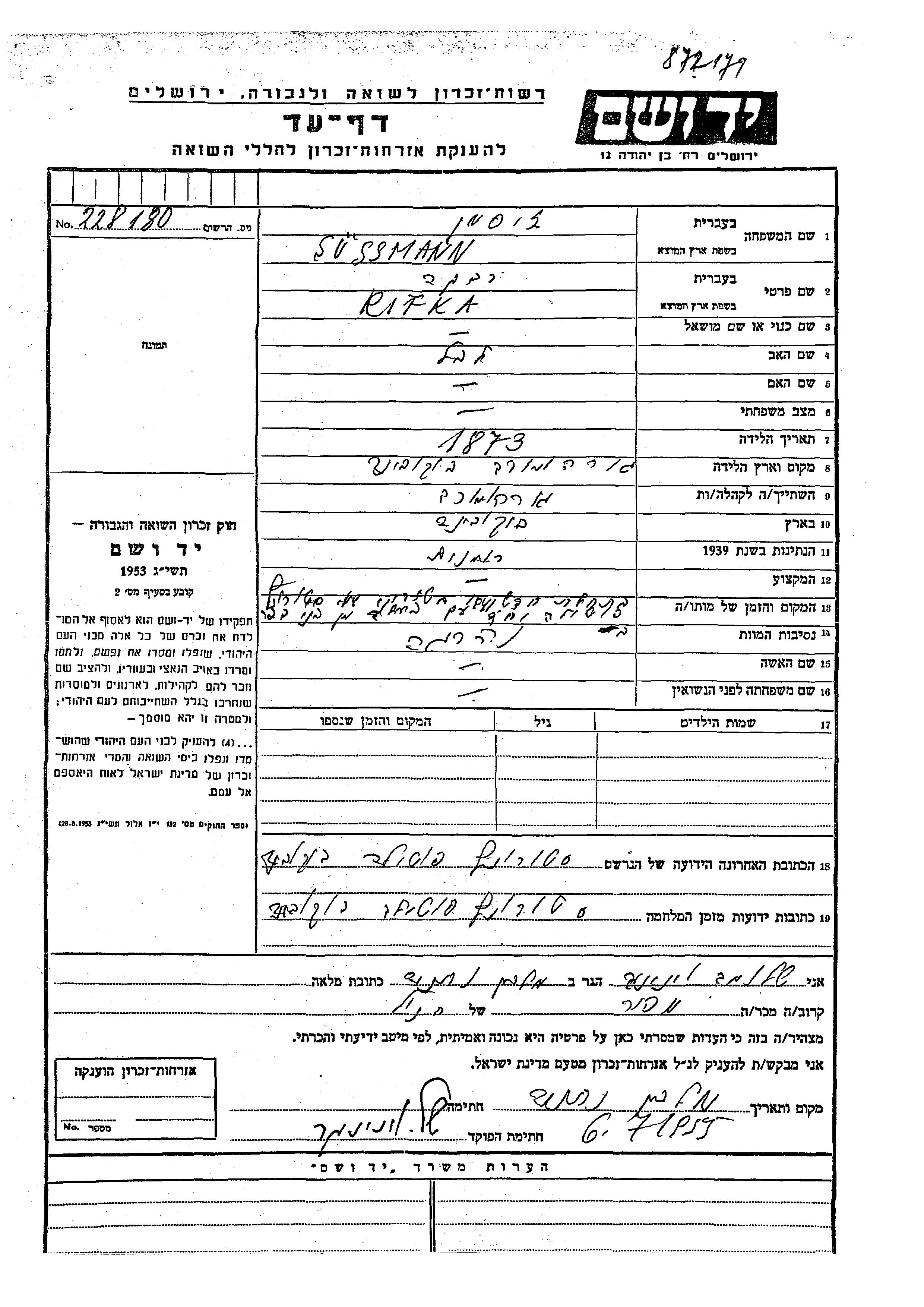 ריפקה Sussmann נולדה בGurahumora שברומניה בשנת 1873 ללבל. היא היתה נשואה. לפני מלחמת העולם השניה התגוררה בGurahumora שברומניה. בזמן המלחמה היא היתה בStorojinetz שברומניה. ריפקה נרצחה בשואה. מקום המוות: Storojinetz שברומניה בשנת 1941.