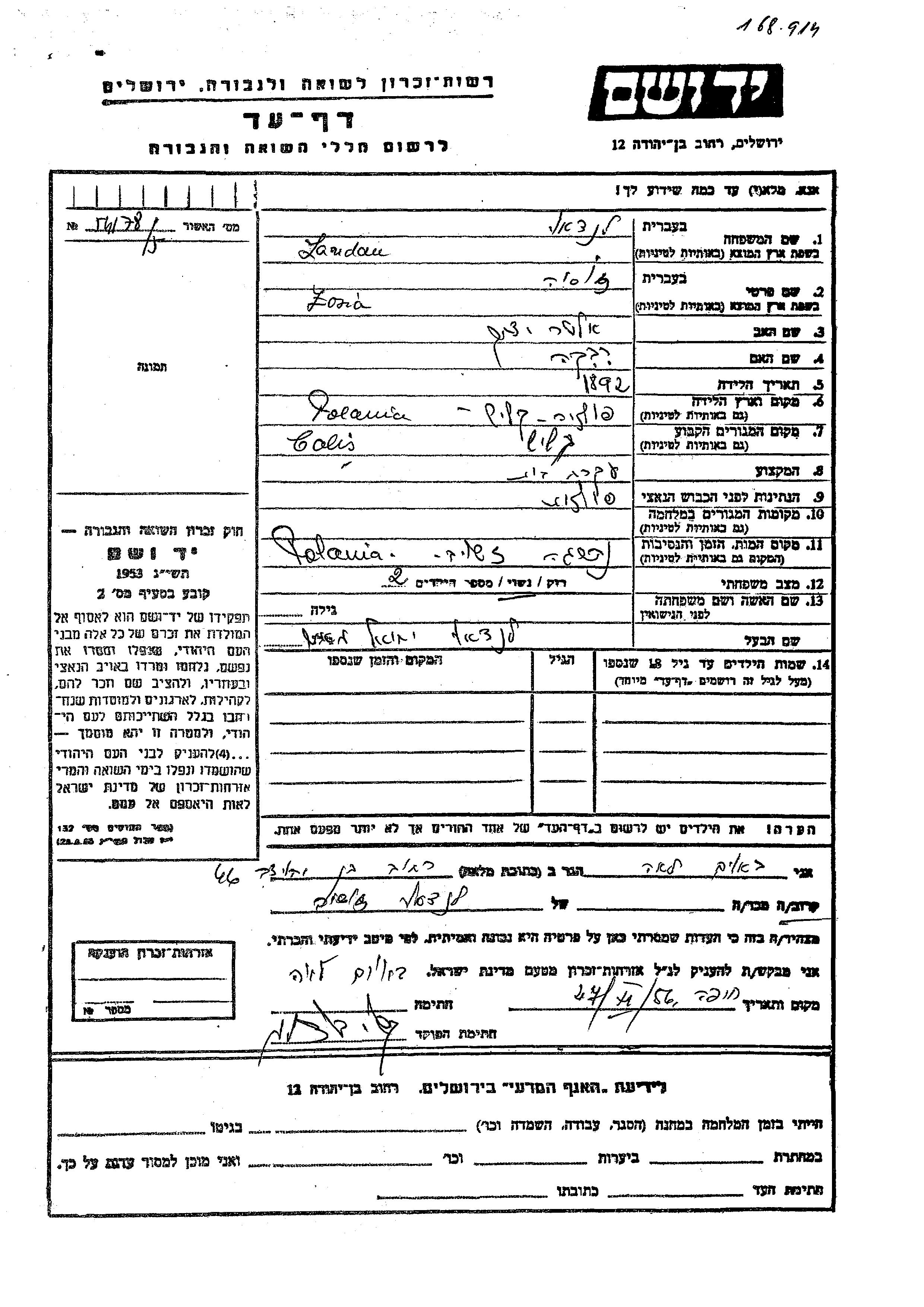 זושה זוסיה לנדאו נולדה בKalisz שבפולין בשנת 1892 לאלטר יצחק ורבקה. היא היתה עקרת בית ונשואה ליחיאל מאיר. לפני מלחמת העולם השניה התגוררה בKalisz שבפולין. זושה זוסיה נרצחה בשואה. מקום המוות: פולין.