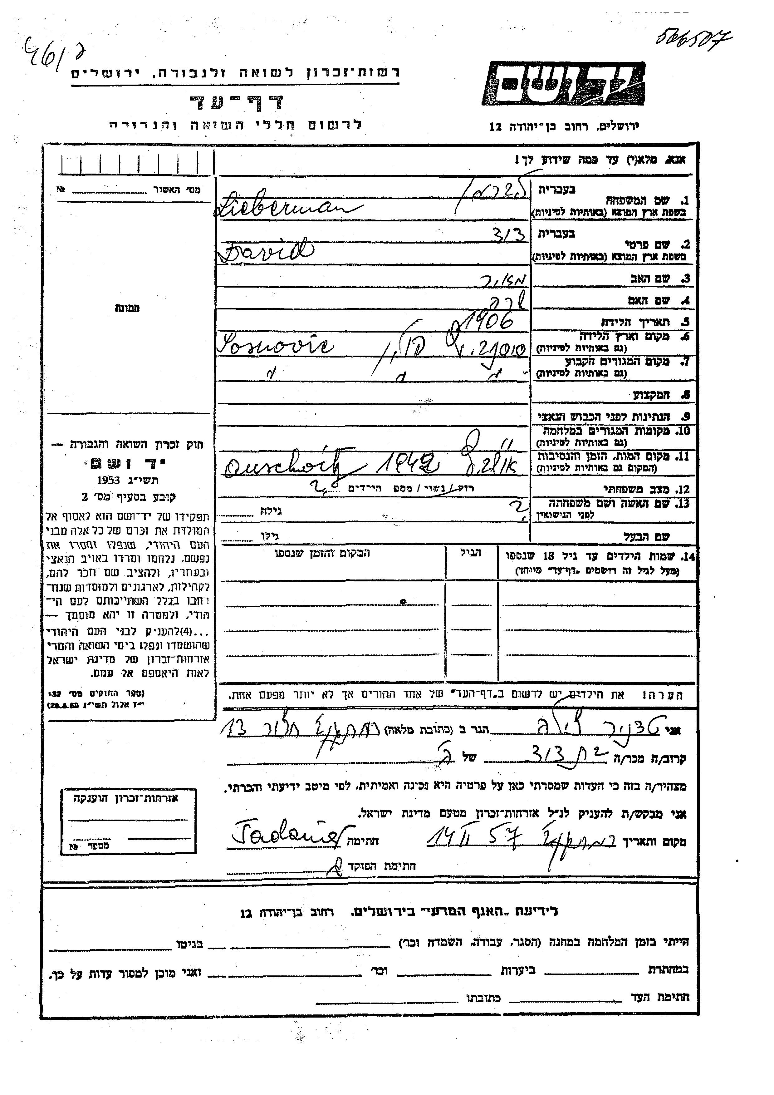 דוד Lieberman נולד בSosnowiec שבפולין בשנת 1906 למאיר ושרה. הוא היה נשוי. לפני מלחמת העולם השניה התגורר בSosnowiec שבפולין. בזמן המלחמה הוא היה בSosnowiec שבפולין.