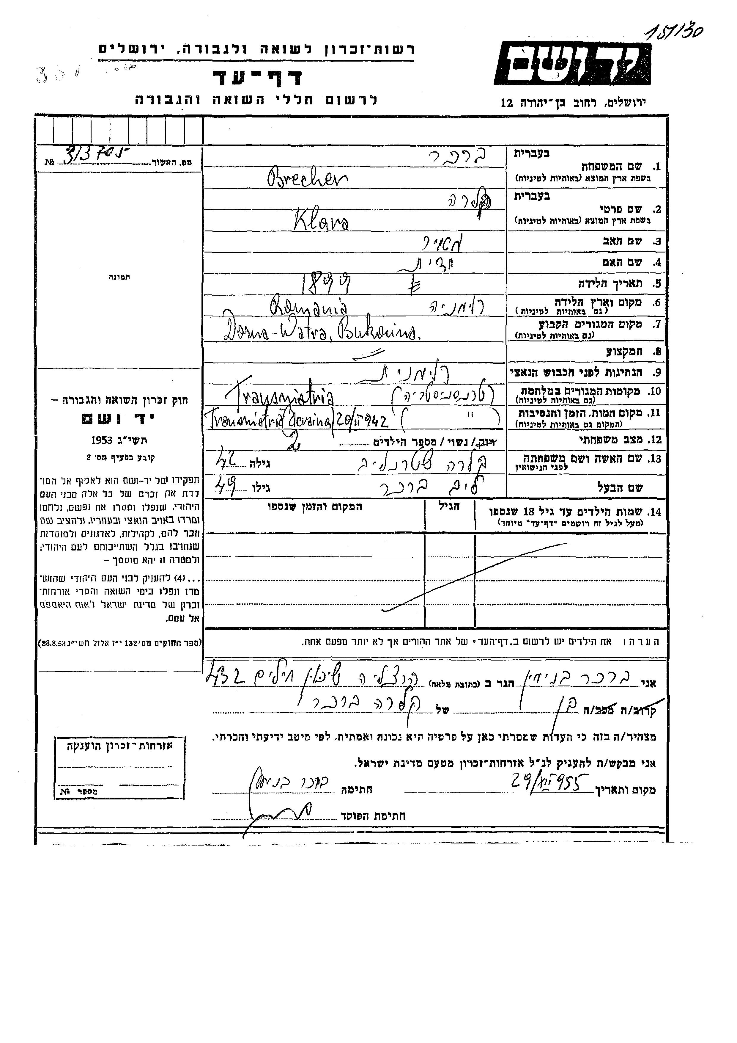 קלרה Brecher לבית שטרנליב נולדה ברומניה בשנת 1899 למאיר ויודית. היא היתה נשואה ללייב. לפני מלחמת העולם השניה התגוררה בDorna Watra שברומניה. בזמן המלחמה היא היתה בTransnistria שבאוקראינה (ברה"מ).
