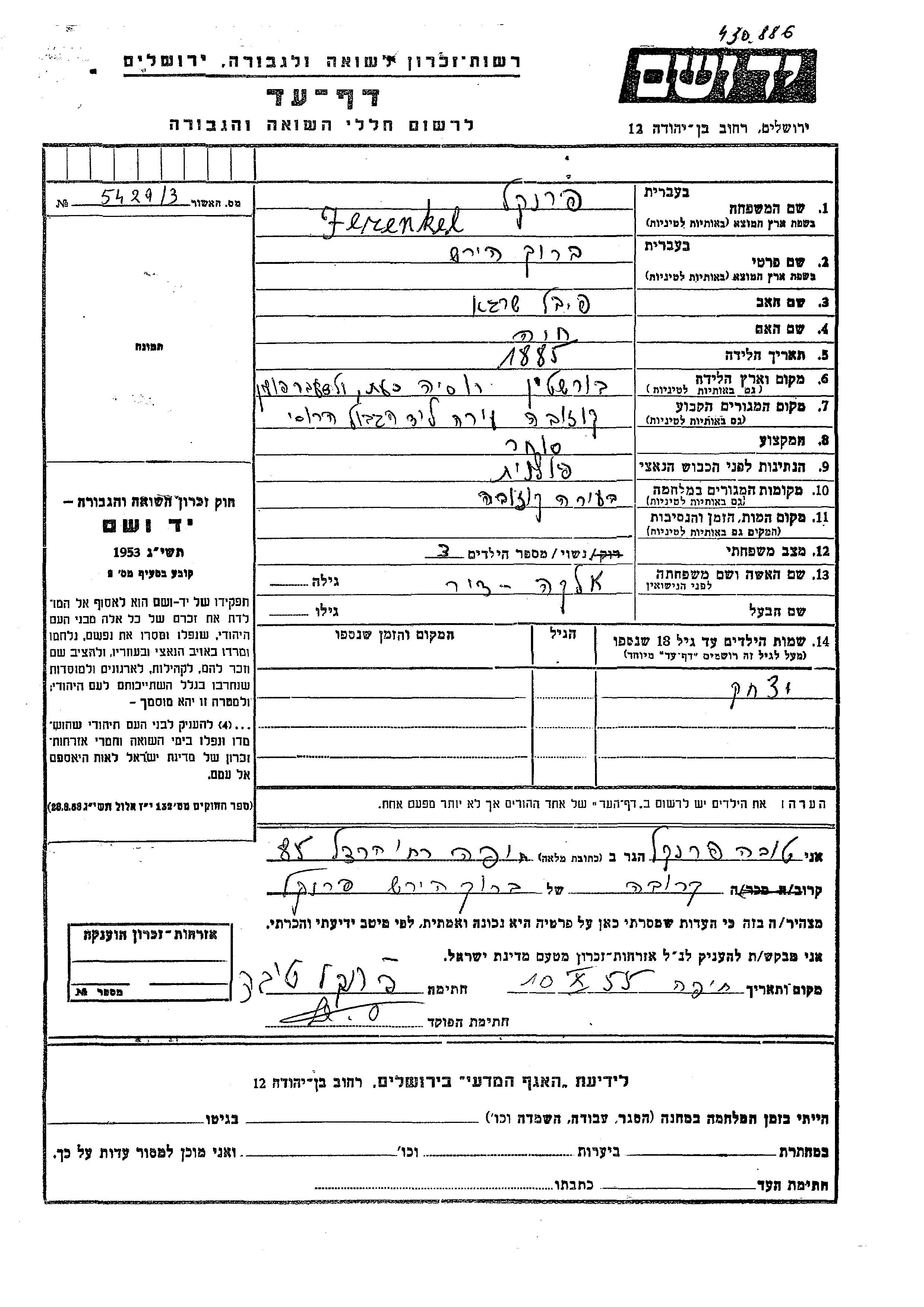 יצחק Ferenkel נולד לברוך הירש ואלקה לבית דיר. הוא היה ילד. לפני מלחמת העולם השניה התגורר בKozova שבפולין. בזמן המלחמה הוא היה בKozojedy שבצ'כוסלובקיה. יצחק נרצח בשואה.