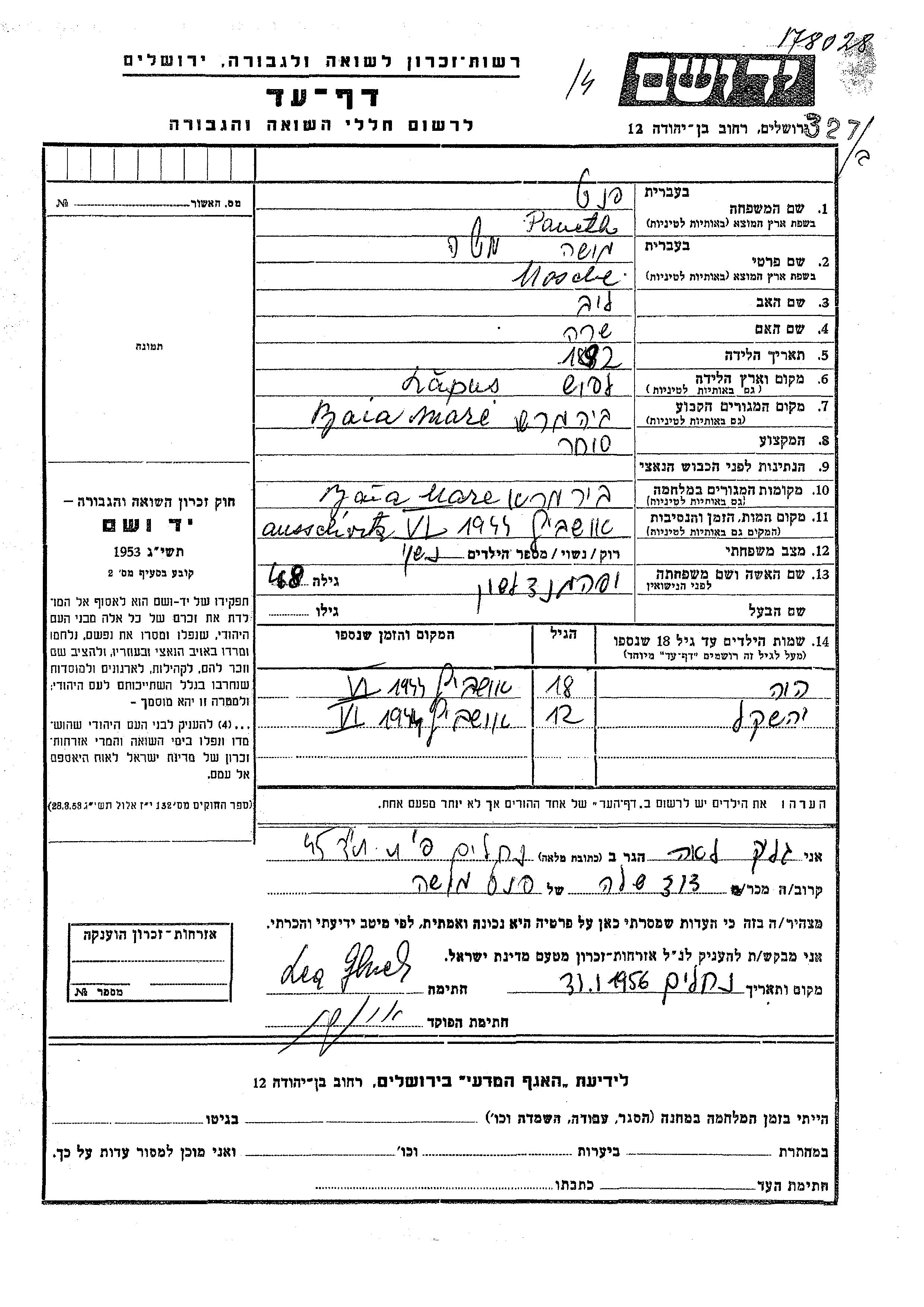 Paneth פנט Mosche 1892 Baia Mare, רומניה דף-עד
