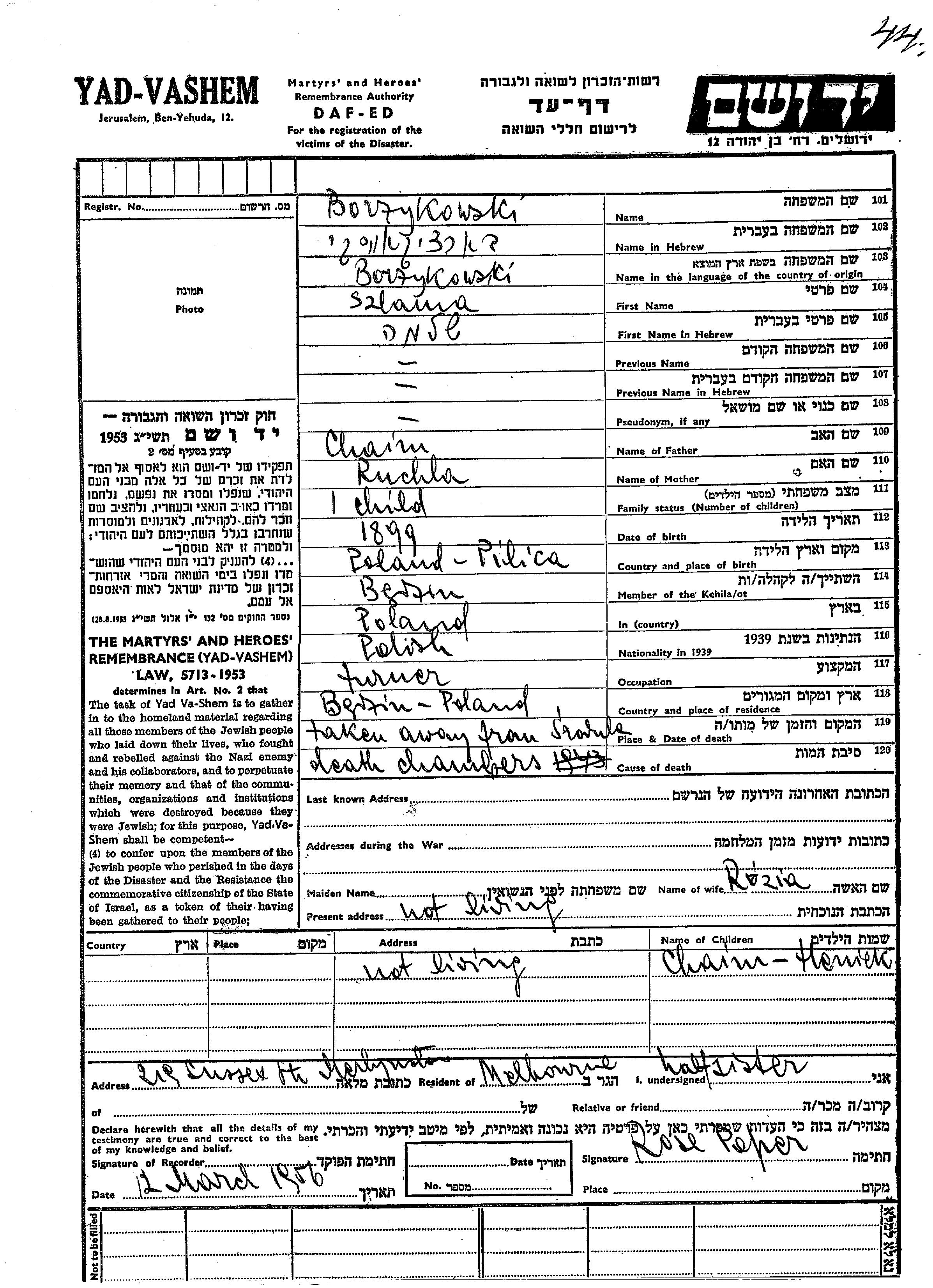 חיים Borzykowski נולד לSzlama וRuzia. הוא היה ילד. לפני מלחמת העולם השניה התגורר בפולין. בזמן המלחמה הוא היה בפולין.