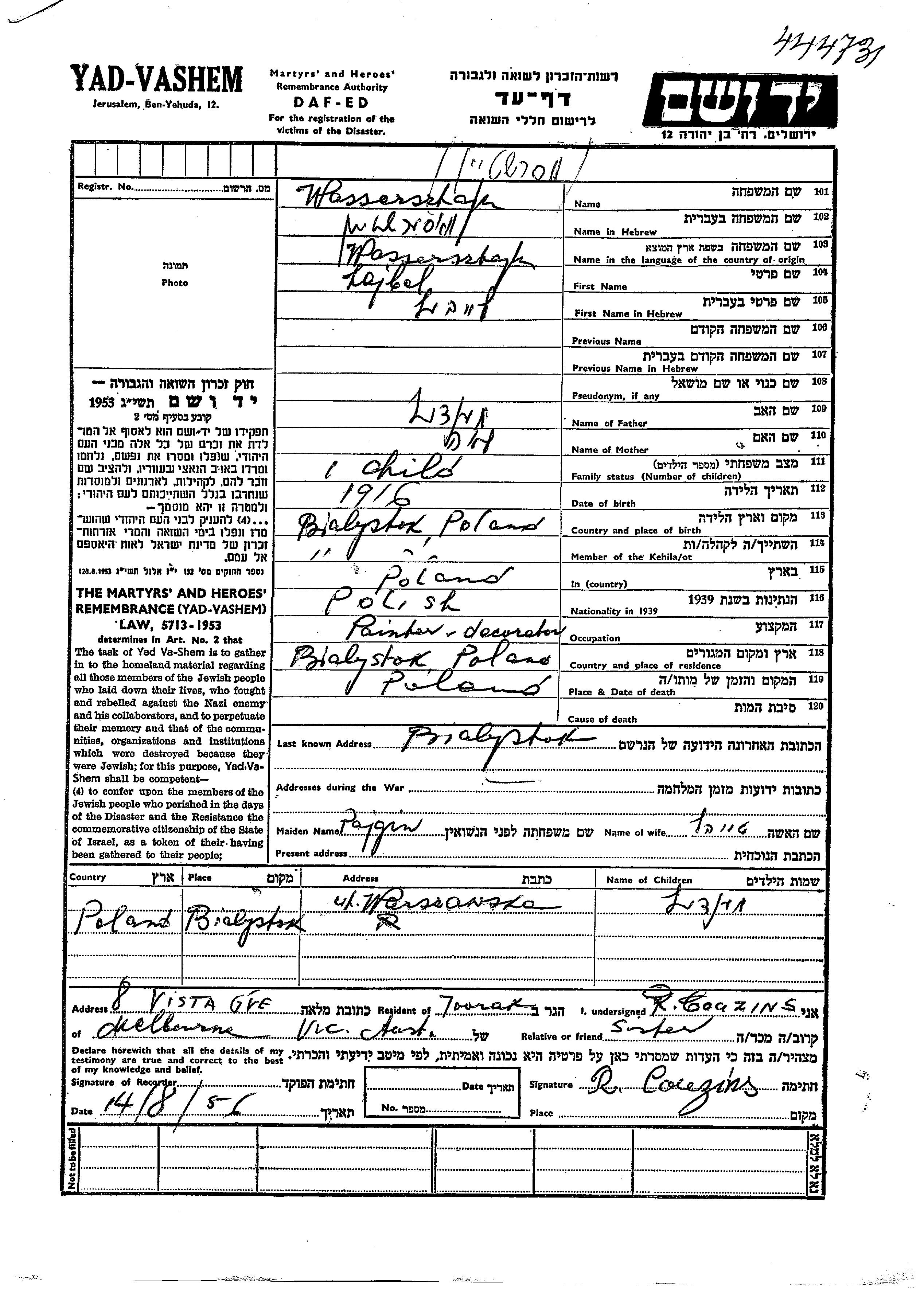 Wassersztajn מענדעל Bialystok, פולין דף-עד