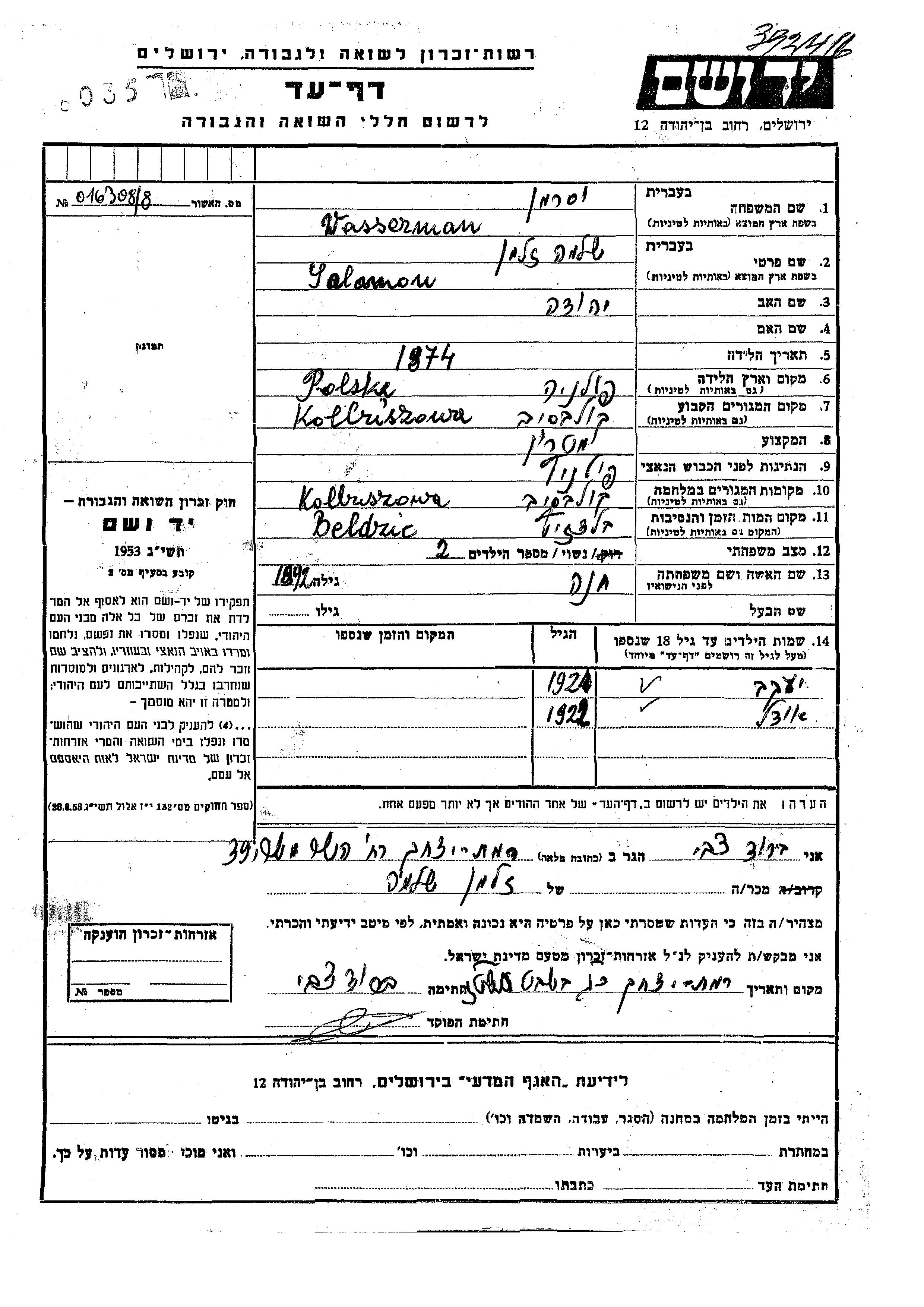 Wasserman יעקב 1924 Kolbuszowa, פולין דף-עד