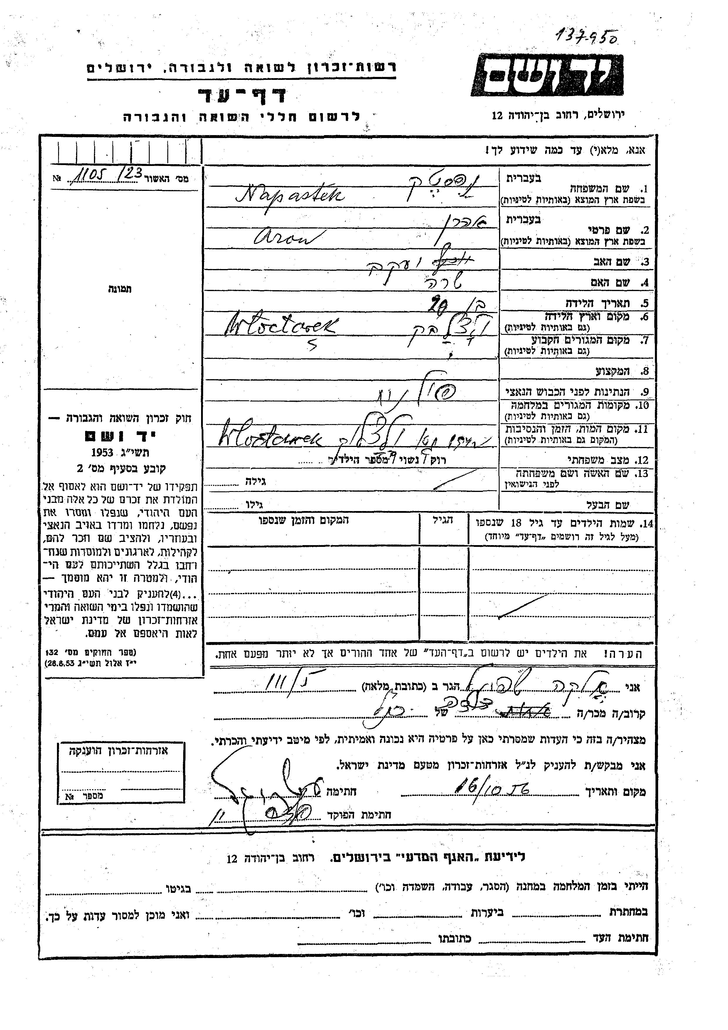 ארון נרצח בשואה. מקום המוות: Wloclawek שבפולין בשנת 1942.