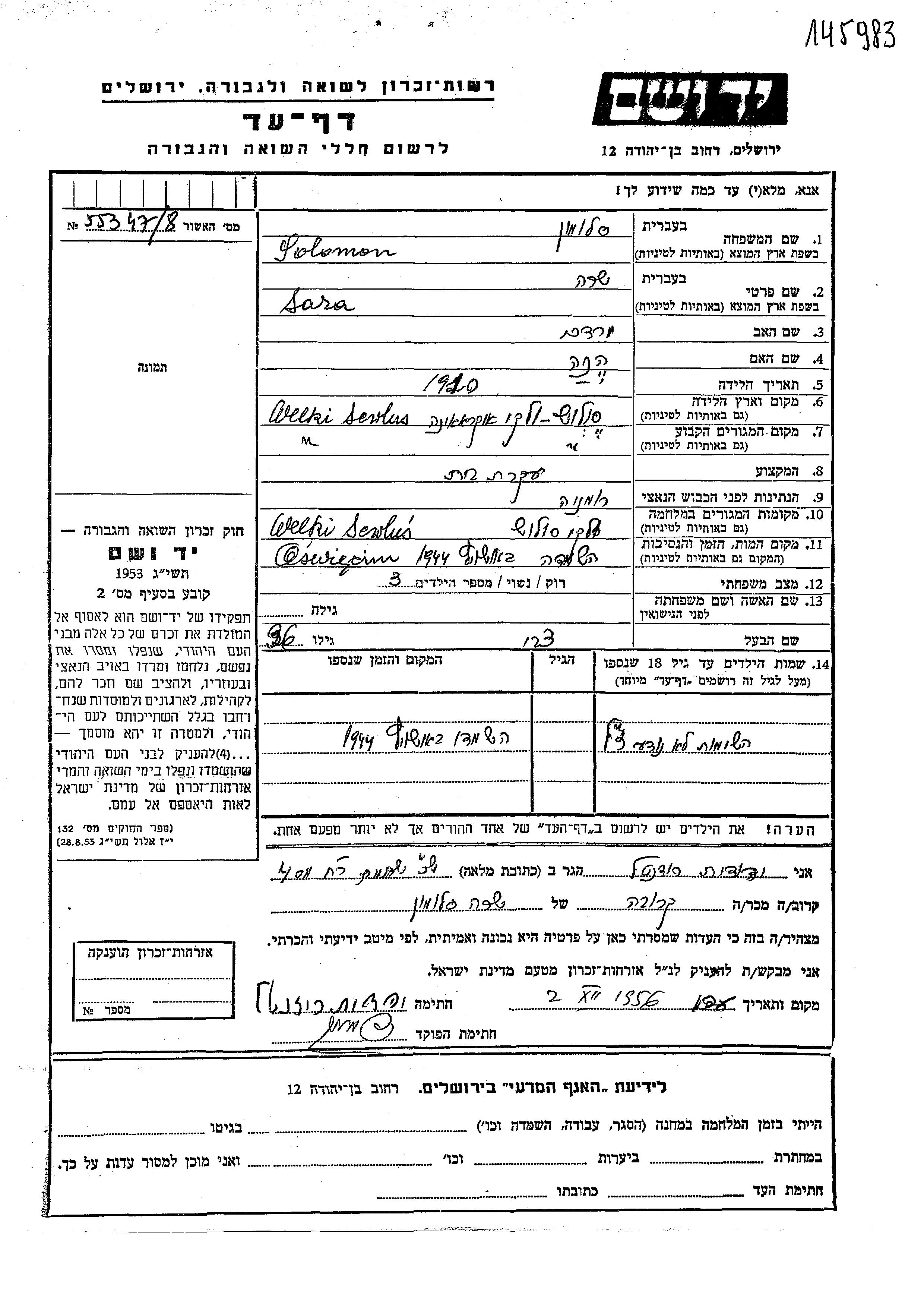 שרה סולומון סלומון נולדה בWelky Sevlus שבצ'כוסלובקיה בשנת 1910 למרדכי והנה. היא היתה עקרת בית ונשואה לצבי. לפני מלחמת העולם השניה התגוררה בWelky Sevlus שבצ'כוסלובקיה. בזמן המלחמה היא היתה בWelky Sevlus שבצ'כוסלובקיה. שרה נרצחה בשואה. מקום המוות: Auschwitz שבפולין בשנת 1944.