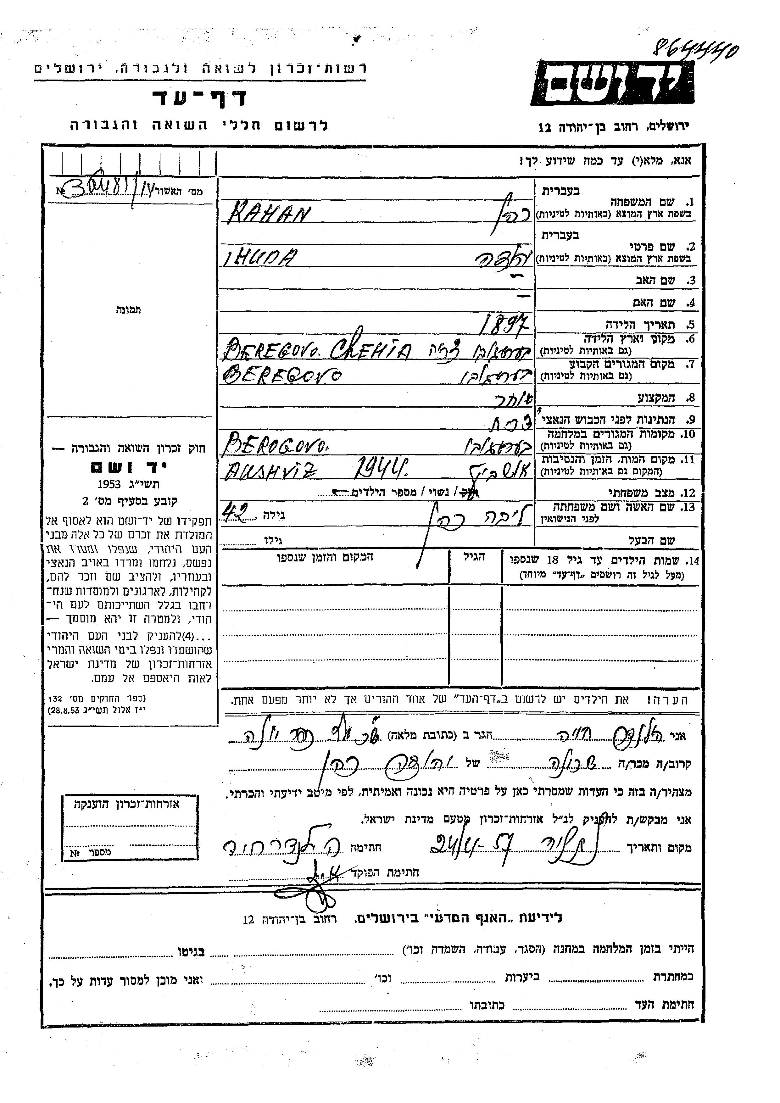 Ihuda Kahan נולד בBeregovo שבצ'כוסלובקיה בשנת 1897. הוא היה סוחר ונשוי לליבה. לפני מלחמת העולם השניה התגורר בBeregovo שבצ'כוסלובקיה. בזמן המלחמה הוא היה בBeregovo שבצ'כוסלובקיה. הוא נרצח בשואה. מקום המוות: Auschwitz שבפולין בשנת 1944.