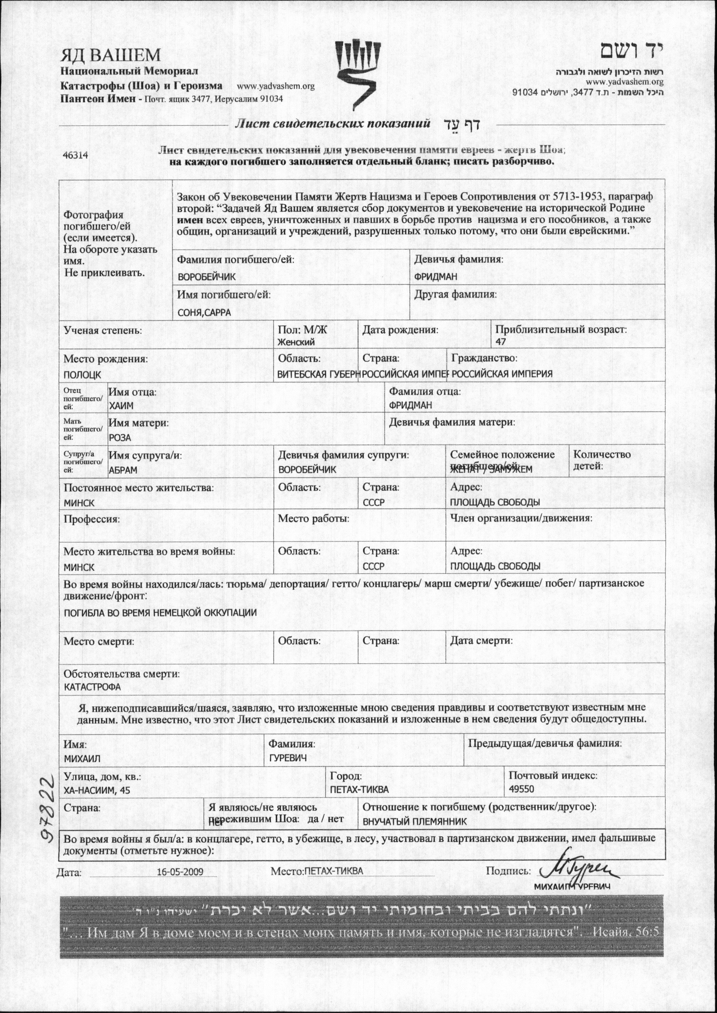 Sonya Sarra Vorobeychik לבית פרידמן נולדה בPolotsk שבביאלורוסיה (ברה"מ) לחיים ורוזה. היא היתה נשואה לAbram. לפני מלחמת העולם השניה התגוררה בMinsk שבביאלורוסיה (ברה"מ). בזמן המלחמה היא היתה בMinsk שבביאלורוסיה (ברה"מ). היא נרצחה בשואה.