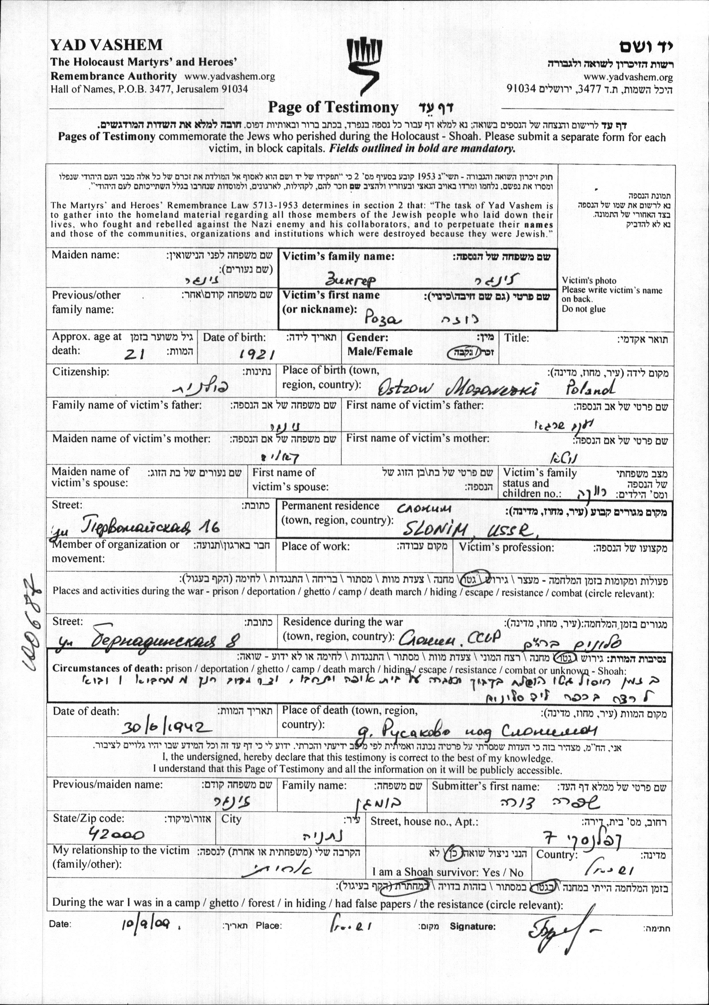 רוזה זינגר נולדה בOstrow Mazowiecki שבפולין בשנת 1921 ליעקב שרגא ויוטא ויטא לבית קאליש. היא היתה רווקה. לפני מלחמת העולם השניה התגוררה בSlonim שבפולין. בזמן המלחמה היא היתה בSlonim שבפולין. רוזה נרצחה בשואה. מקום המוות: Slonim שבפולין בשנת 30/06/1942.