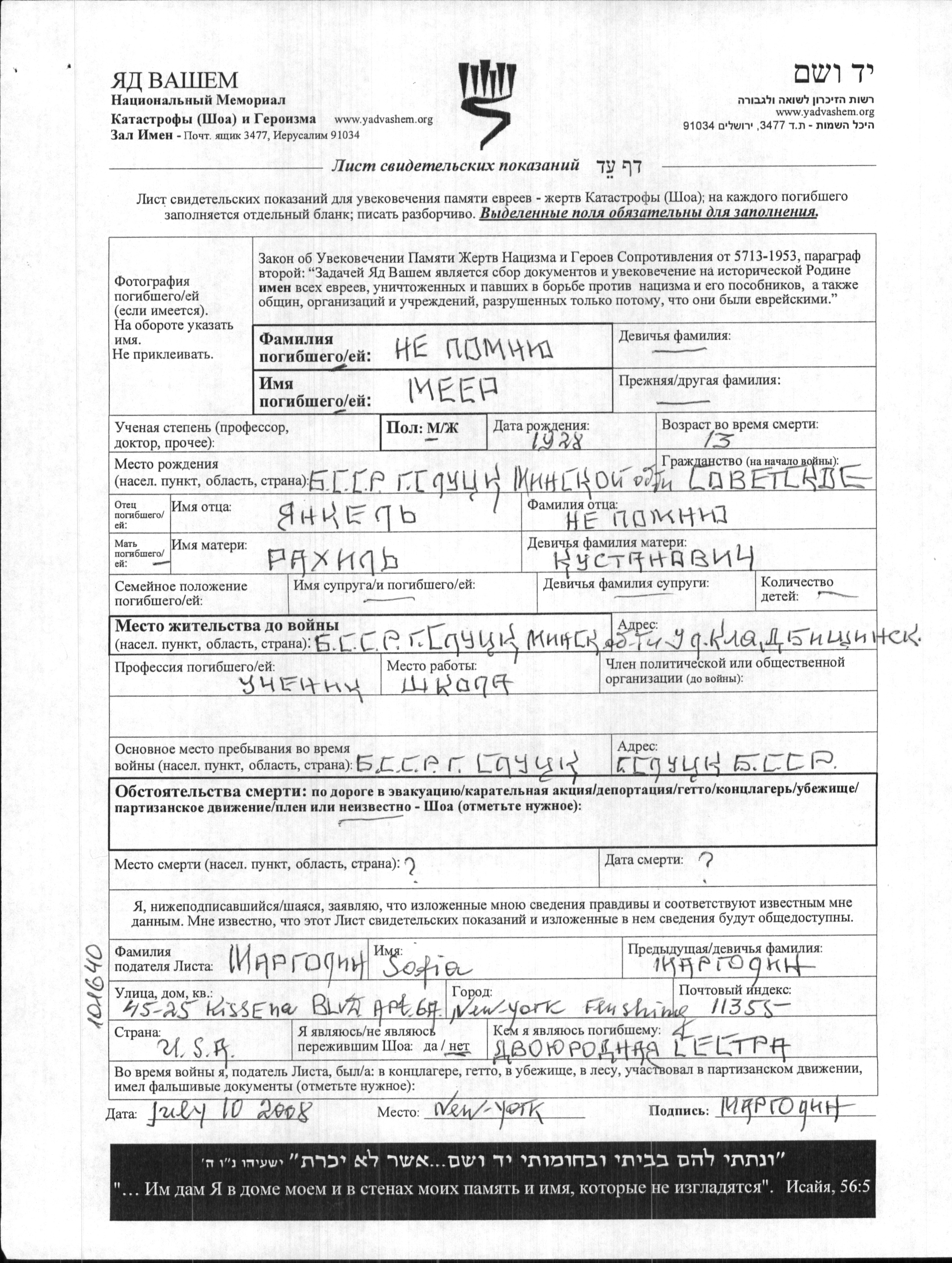 Meyer שם משפחה לא ידוע נולד בSlutsk שבביאלורוסיה (ברה"מ) בשנת 1928 לYankel וRakhil לבית Kustanovich. הוא היה תלמיד ונער. לפני מלחמת העולם השניה התגורר בSlutsk שבביאלורוסיה (ברה"מ). בזמן המלחמה הוא היה בSlutsk שבביאלורוסיה (ברה"מ).