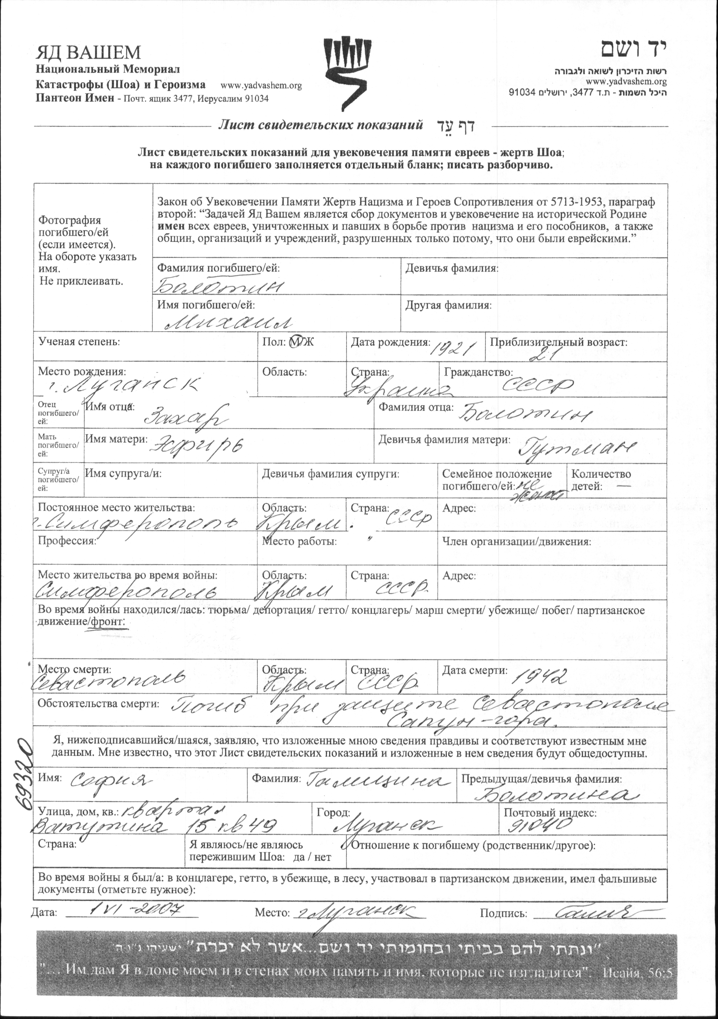 Mikhail בולוטין נולד בLugansk שבאוקראינה (ברה"מ) בשנת 1921 לZakhar וEsfir לבית גוטמן. הוא היה רווק. לפני מלחמת העולם השניה התגורר בSimferopol שברוסיה (ברה"מ). בזמן המלחמה הוא היה בצבא הסובייטי. הוא נהרג בשירות צבאי. מקום המוות: Sevastopol שברוסיה (ברה"מ) בשנת 1942.