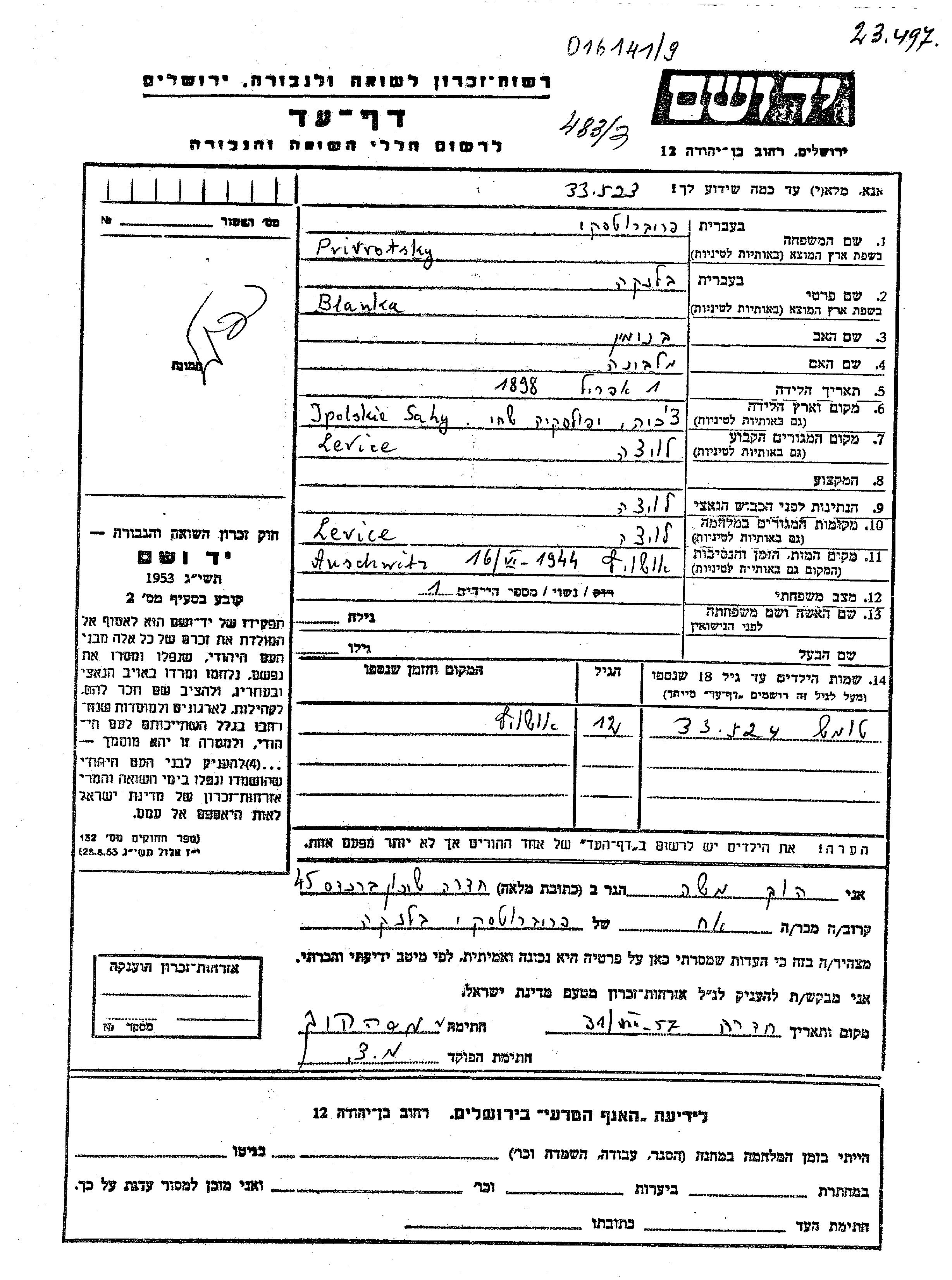 טומש Privrotsky נולד לבלנקה. הוא היה ילד. לפני מלחמת העולם השניה התגורר בLevice שבצ'כוסלובקיה. בזמן המלחמה הוא היה בLevice שבצ'כוסלובקיה.