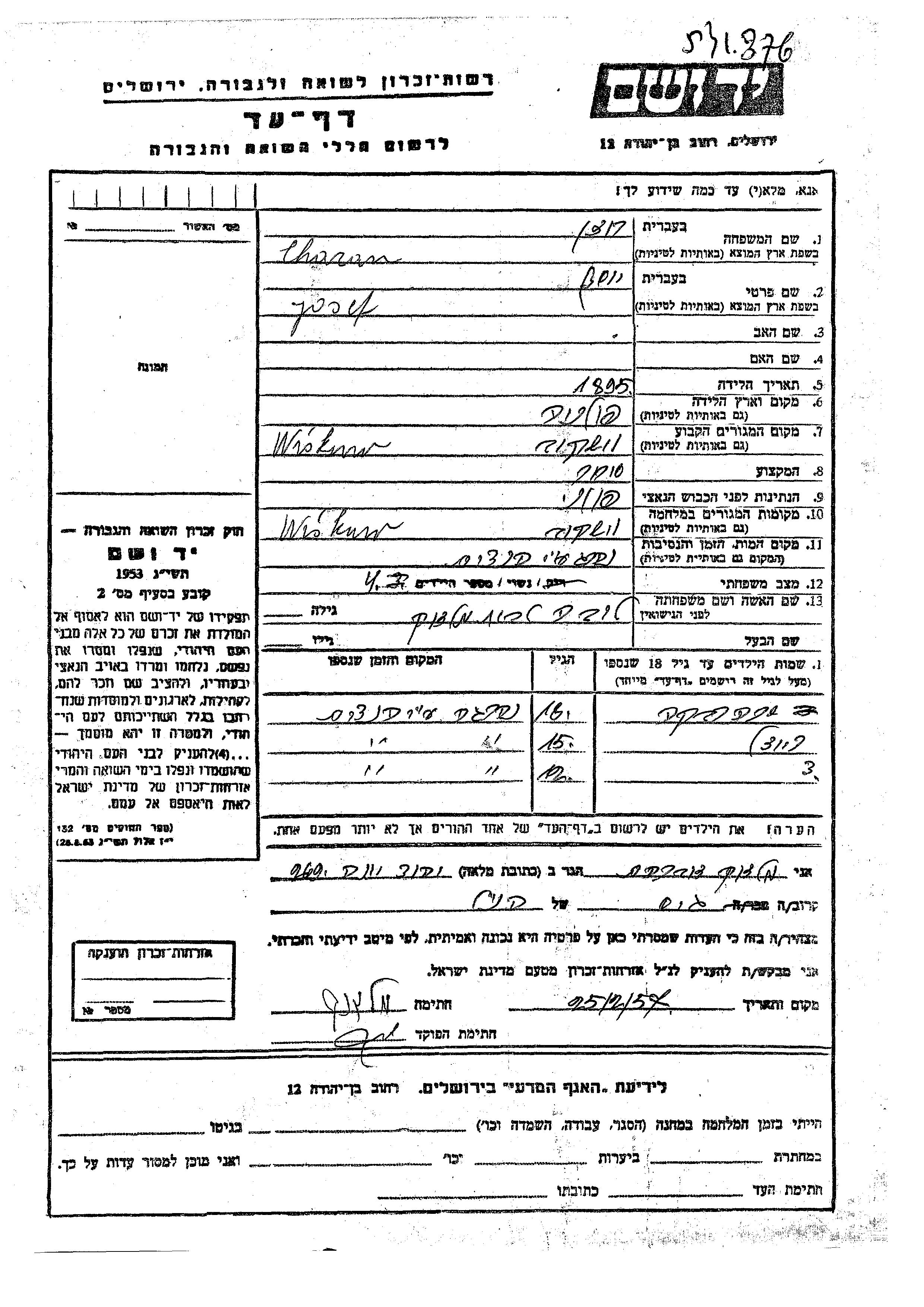 ד Chazan נולד/ה לJosef ולובה לבית מלאך. הוא/היא היה/היתה ילד/ילדה. לפני מלחמת העולם השניה התגורר/התגוררה בWiskow שבפולין. בזמן המלחמה הוא/היא היה/היתה בWiskow שבפולין. ד נרצח/ה בשואה.
