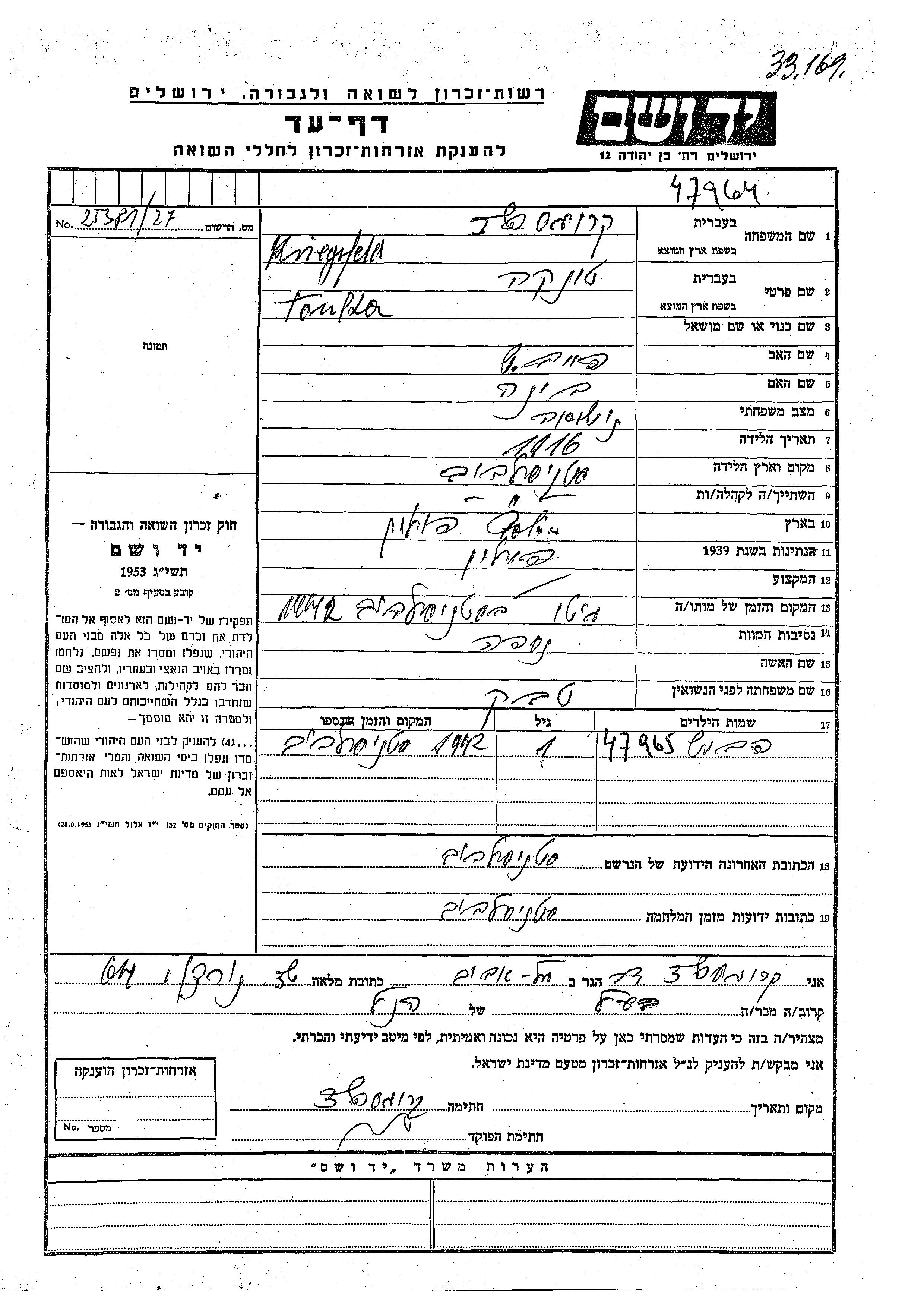 יד ושם - המפעל להנצחת השמות בדפי עד