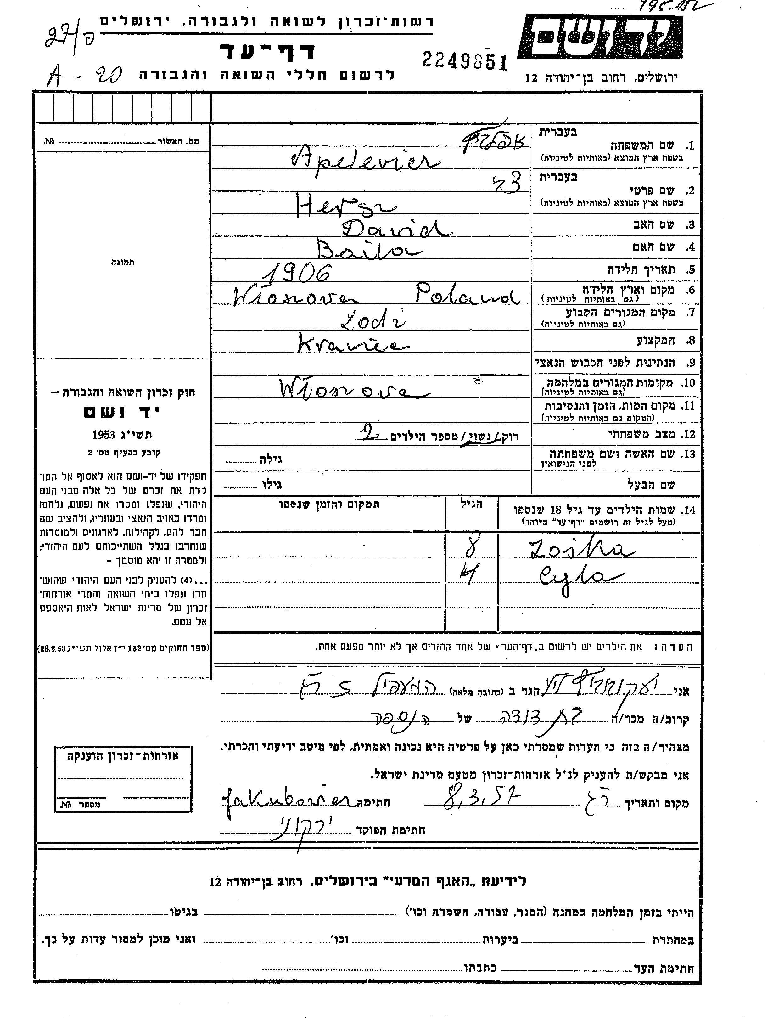 Cyla Apelewicz נולדה לHersz צבי. היא היתה ילדה. לפני מלחמת העולם השניה התגוררה בWloszczowa שבפולין. בזמן המלחמה היא היתה בLodz שבפולין.