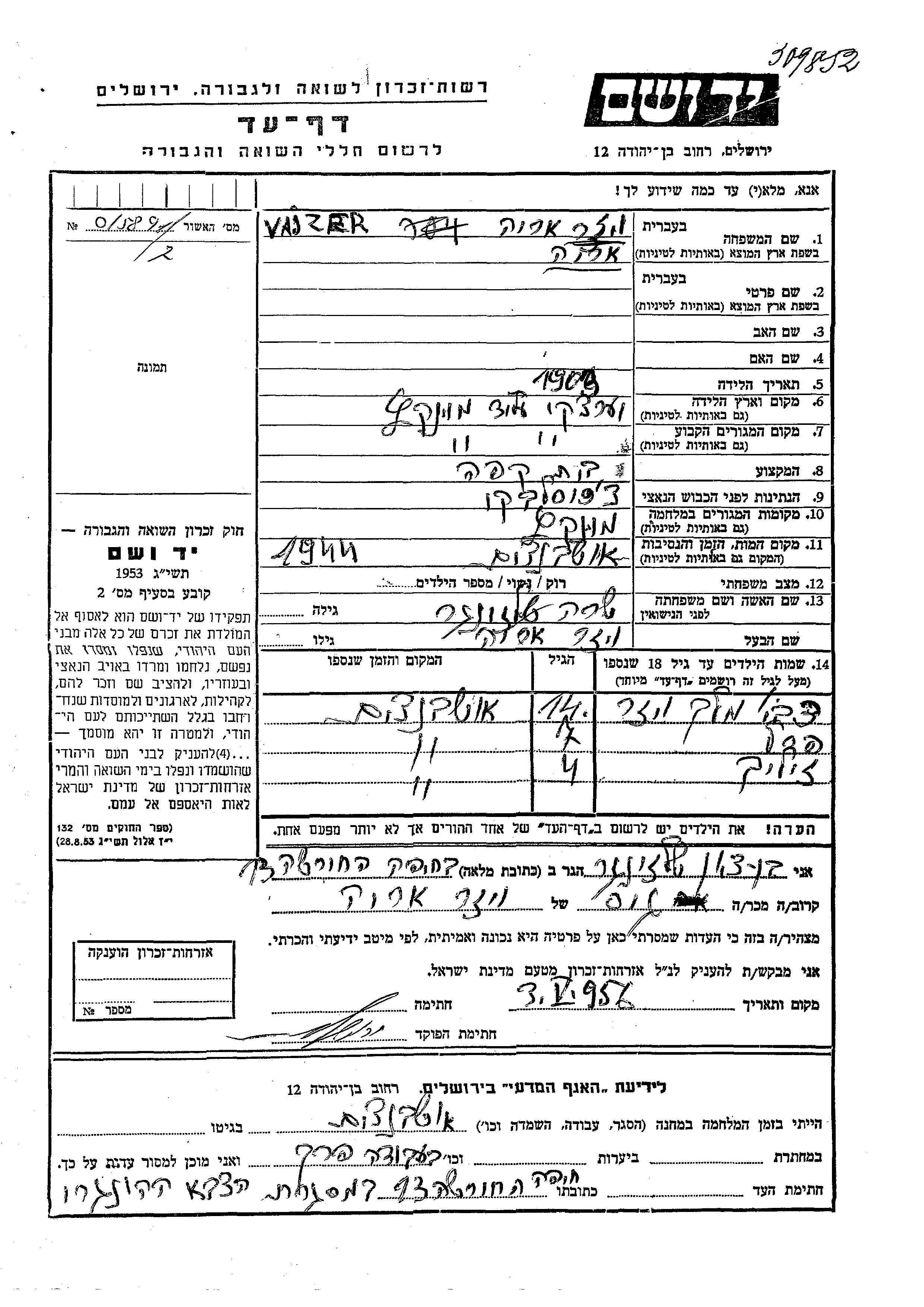 זיליק ויזר נולד לאריה ושרה לבית שלזינגר. הוא היה ילד. לפני מלחמת העולם השניה התגורר בVerecki שבצ'כוסלובקיה. בזמן המלחמה הוא היה בMunkacz שבצ'כוסלובקיה. זיליק נרצח בשואה.