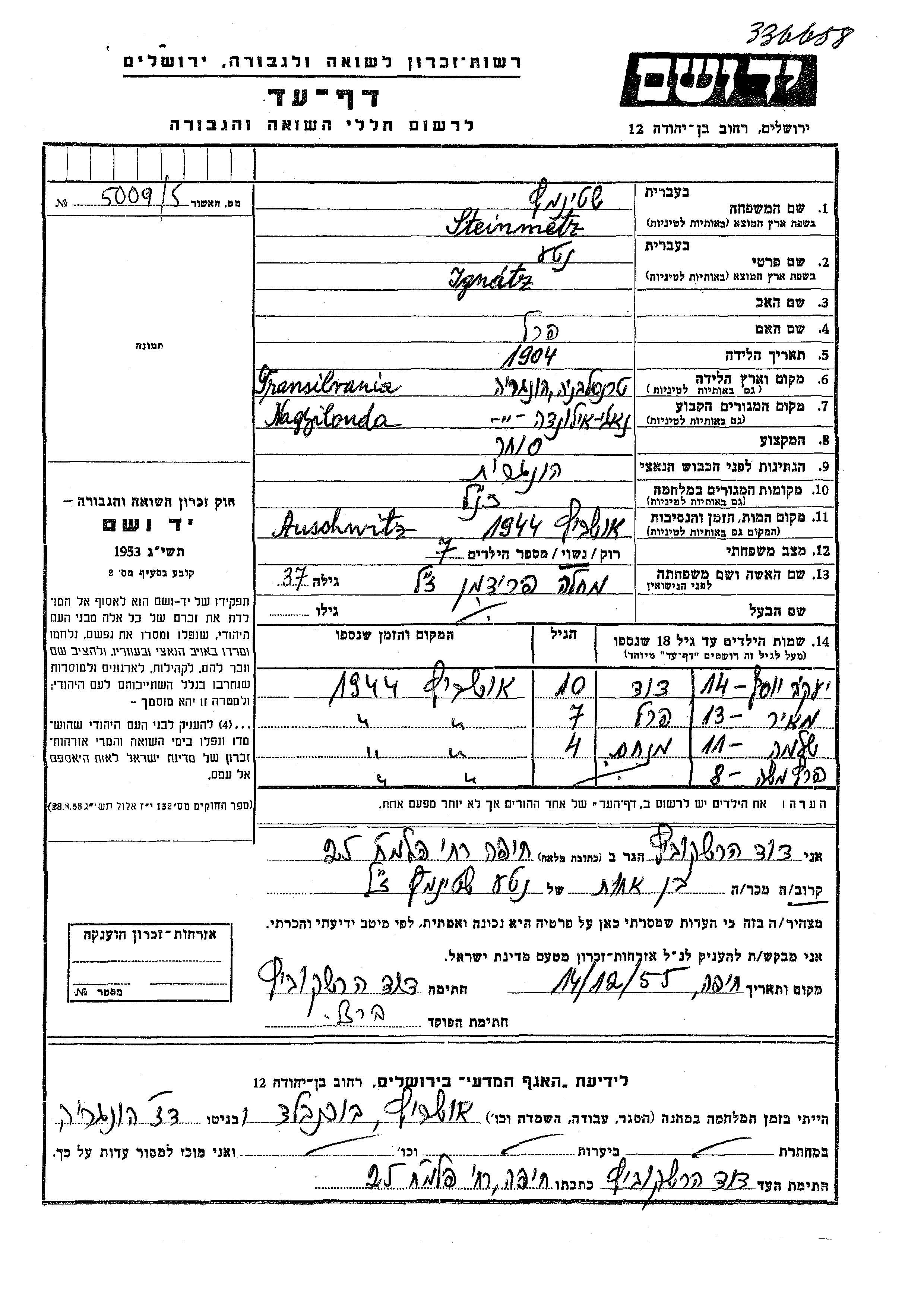פרץ משה Steinmetz נולד לJgnatz נטע ומחלה לבית פרידמן. הוא היה ילד. לפני מלחמת העולם השניה התגורר בNagyilonda שברומניה. בזמן המלחמה הוא היה בNagyilonda שברומניה. פרץ משה נרצח בשואה.
